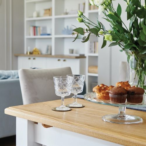 Szafka rtv Fryderyka oraz kredens Leokadia zostały wykonane przez polską firmę meblarnia.com.pl. Te meble to połączenie klasyki i nowoczesności – eleganckie, stylowe i praktyczne. Udało się je dopasować do stołu jadalnego i biblioteki. Dzięki nim salon zyskał więcej przytulności.