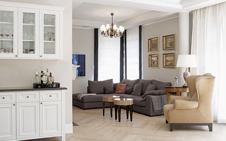 – Miało być nowocześnie i lekko – dodaje architektka Agnieszka Pudlik. – Ale Bogusia i Jurek nie przestali cenić klasyki. Zatem nowoczesny szyk z tradycyjnymi elementami był tu jak najbardziej na miejscu. Biało-czarno-szare kolory, konsekwentnie utrzymane w całym domu, wprowadzają klimat wysublimowanej elegancji. Podobnie jak efektowna, stylowa boazeria niczym z kultowych nowojorskich apartamentów, pałacowa biało-czarna marmurowa podłoga i lakierowane fronty nowoczesnych sprzętów: czarnej lekkiej konsoli czy białej stylizowanej na lata pięćdziesiąte lodówki.