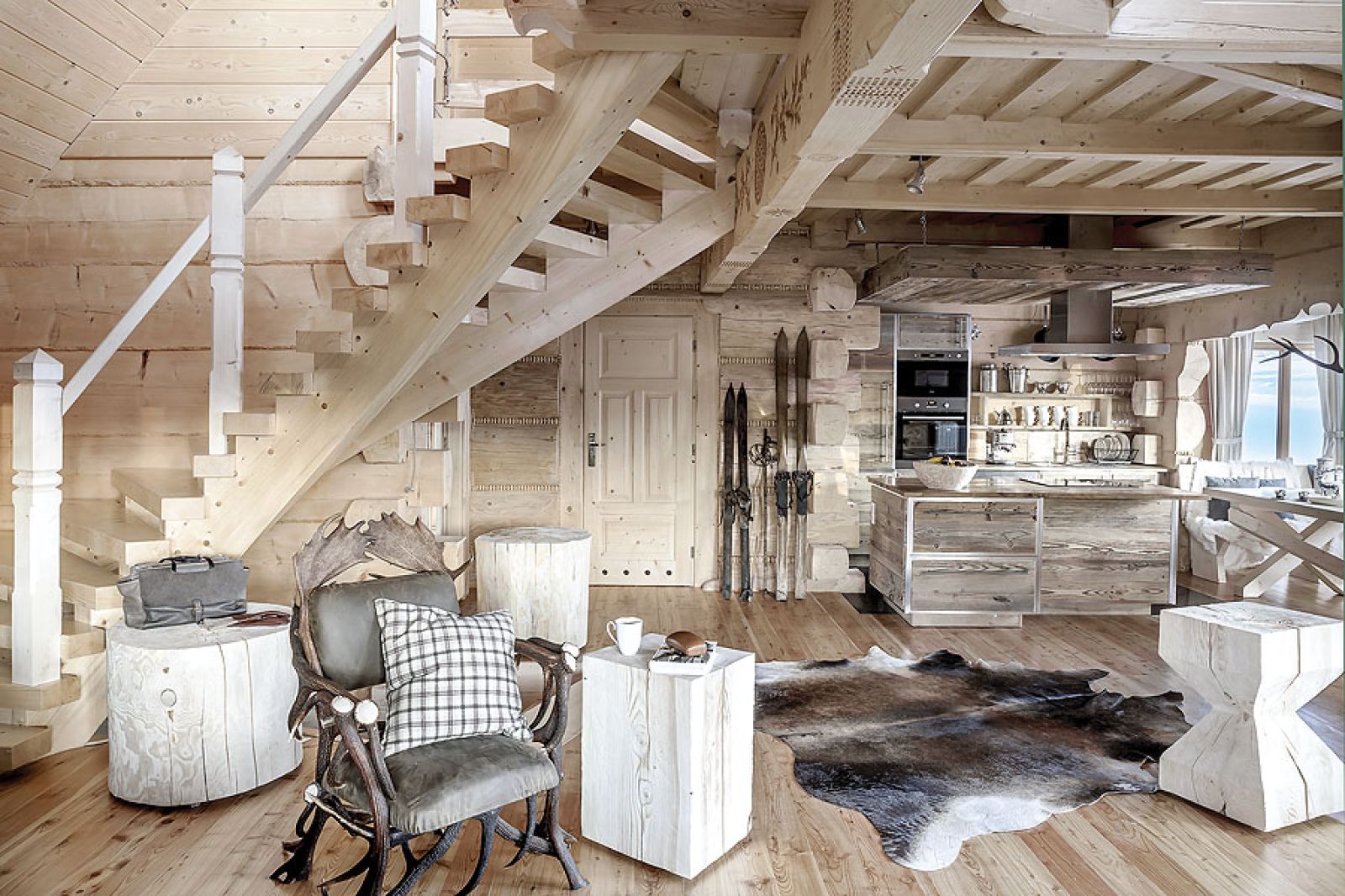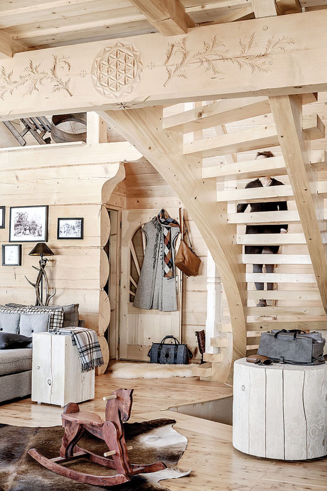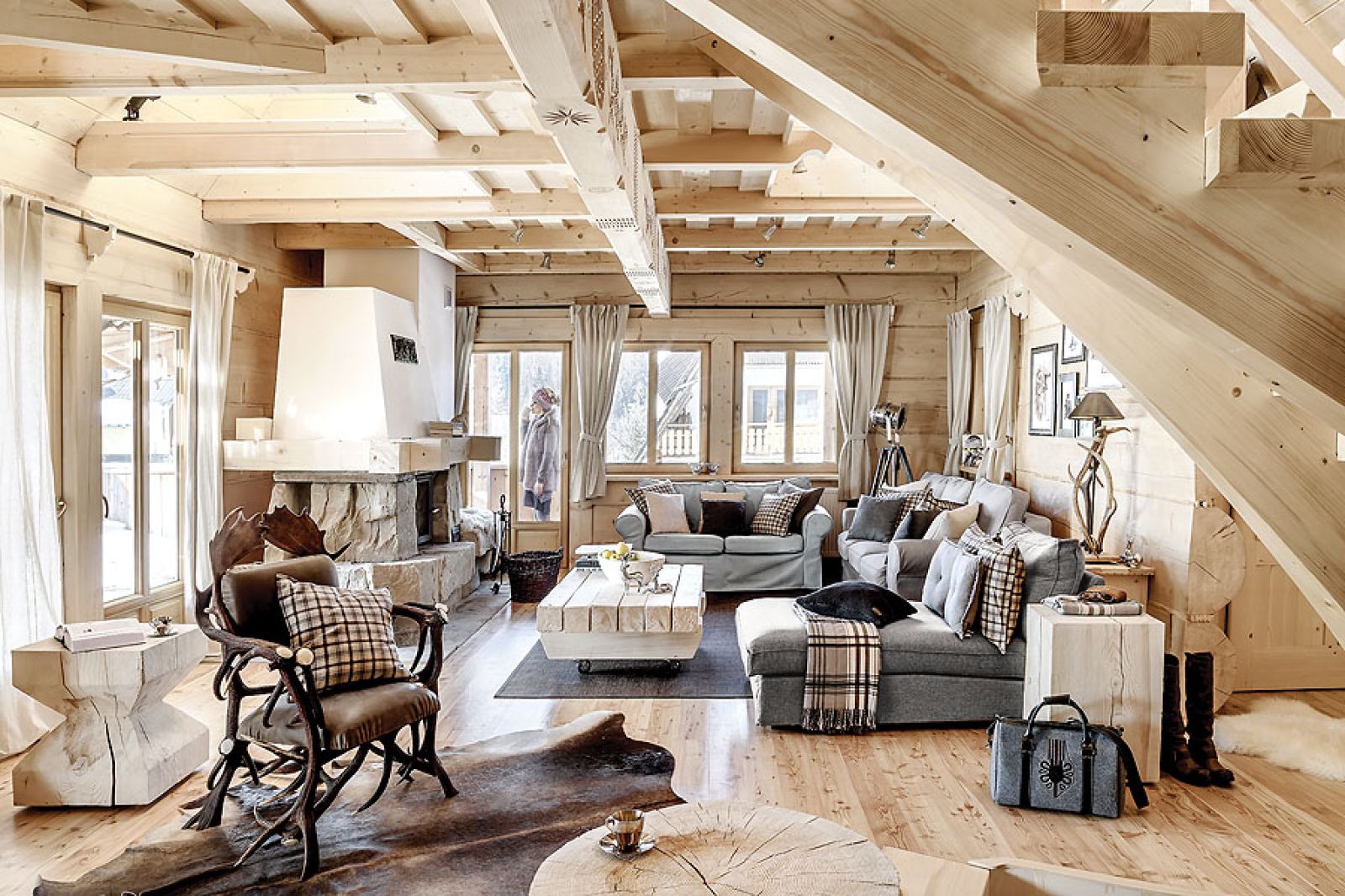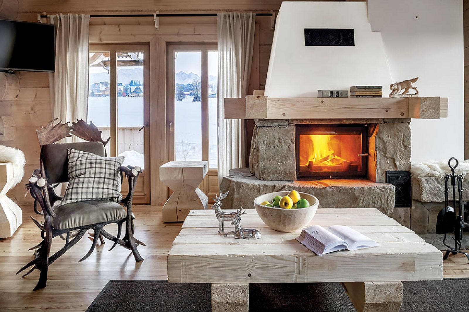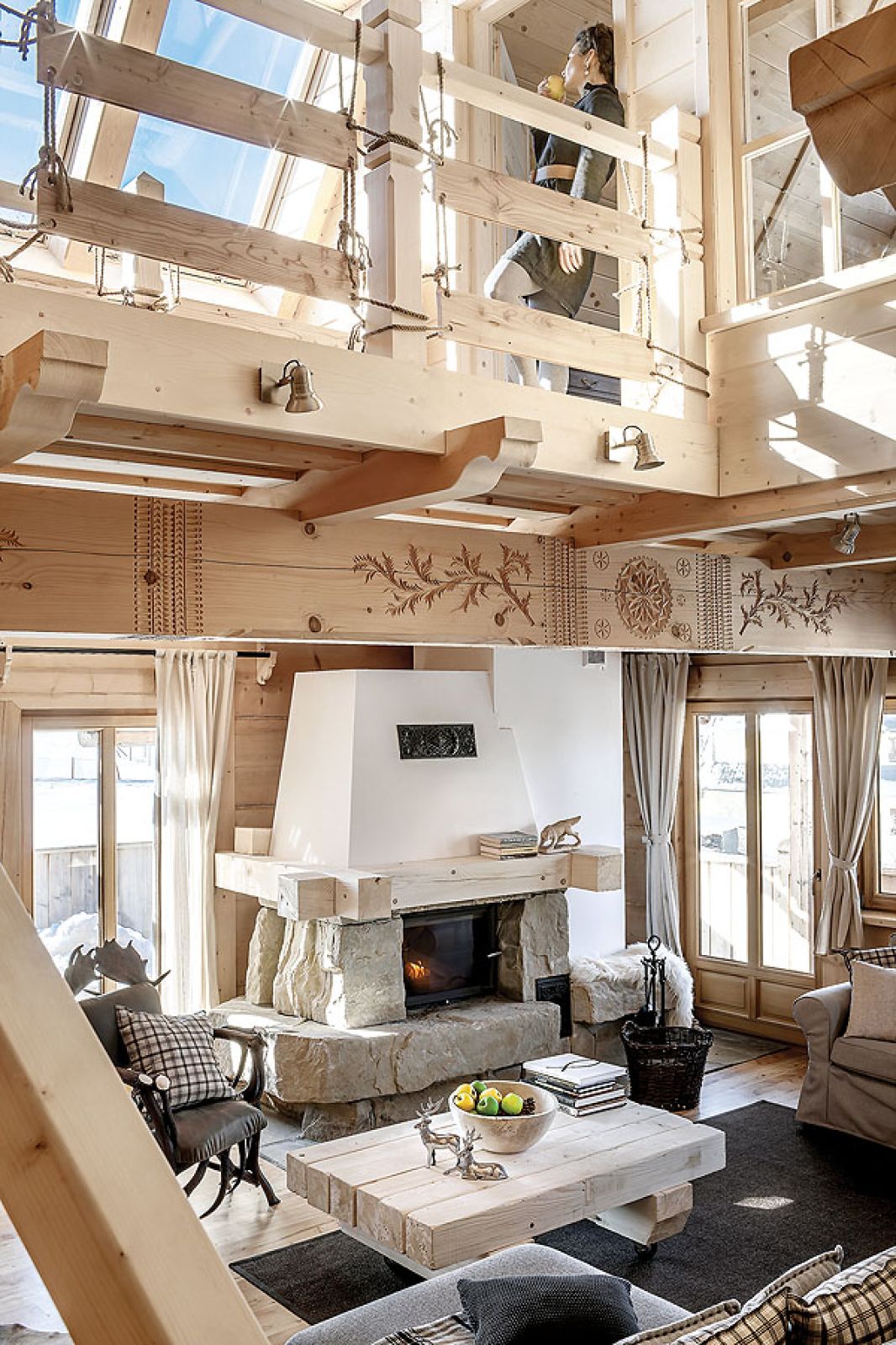 Niemal niczego tu nie kupowała, wszystko zostało ręcznie zrobione według jej projektów. W kuchni stare, wypalone słońcem deski świerkowe z firmy Regalia ubrała w ramy z polerowanego aluminium. W salonie masywne schody na giętych wangach zawiesiła na rzeźbionym sosrębie, stanowiącym też podporę belek sufitowych i kładki do jednej z sypialni. Olbrzymie górskie skały na kominek trzeba było dźwigiem wkładać do salonu w czasie budowy – wspomina architektka. – Masywne lite stoliki powstały z pni o prawie metrowej średnicy. A świerkowe komody, półki, blaty stołów i ław oraz drzwi – z drewna szczotkowanego, bo to pięknie uwydatnia usłojenie.