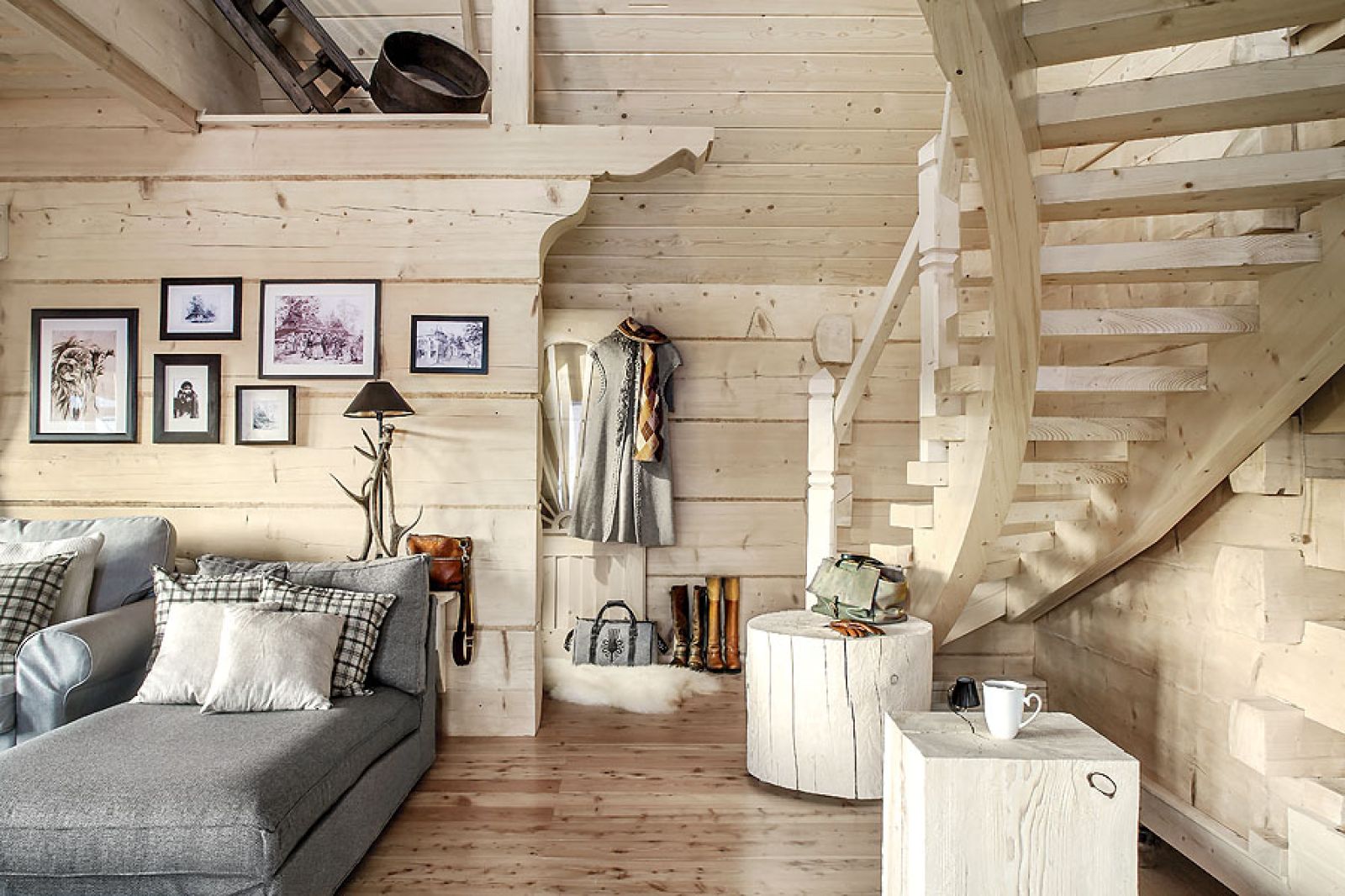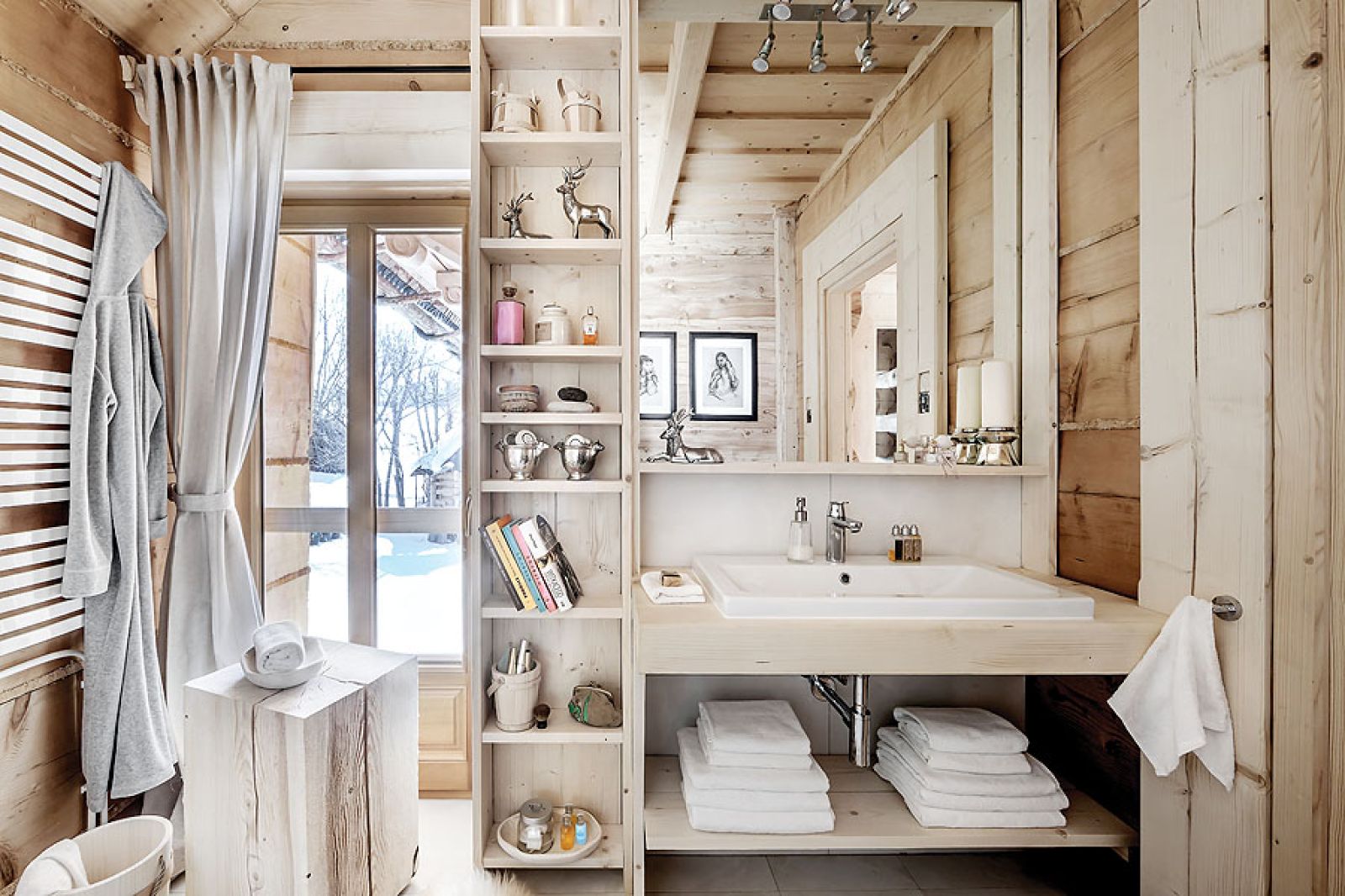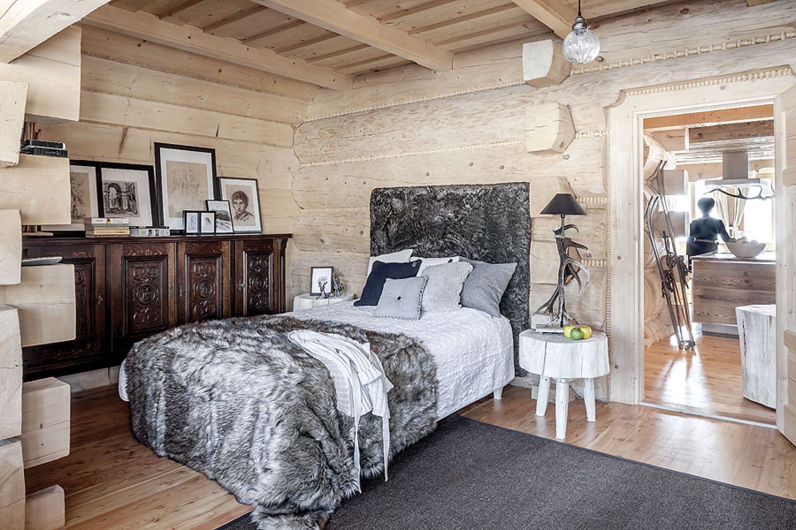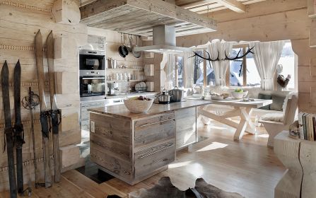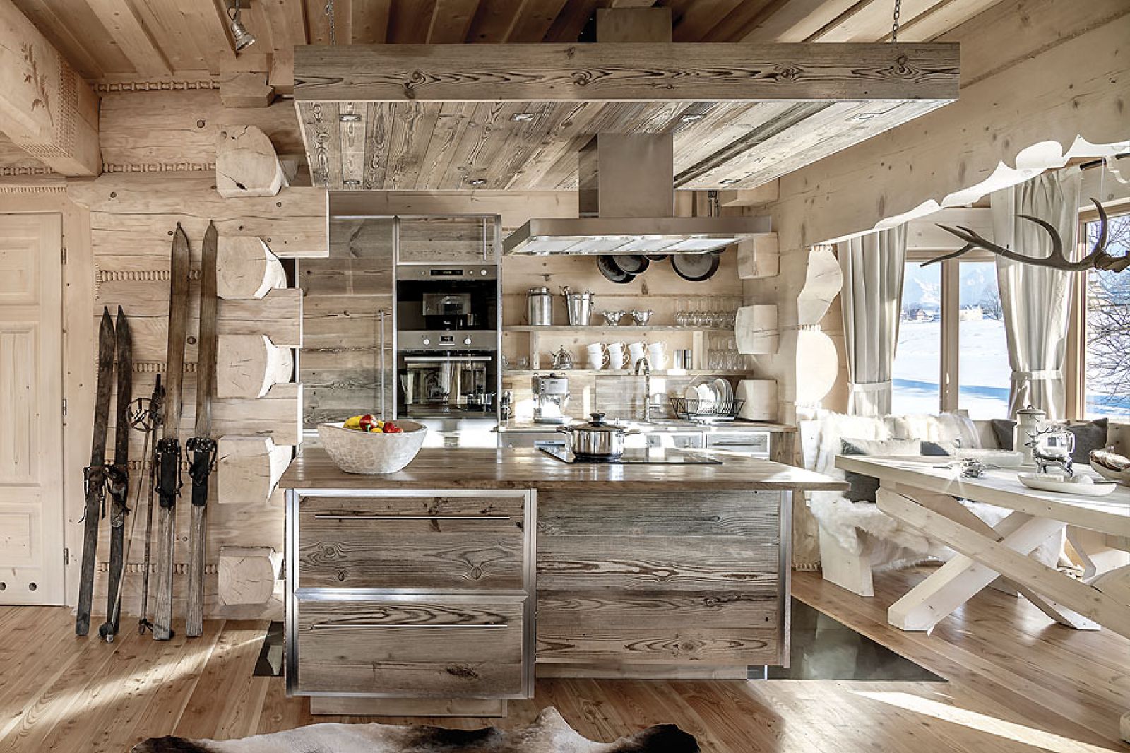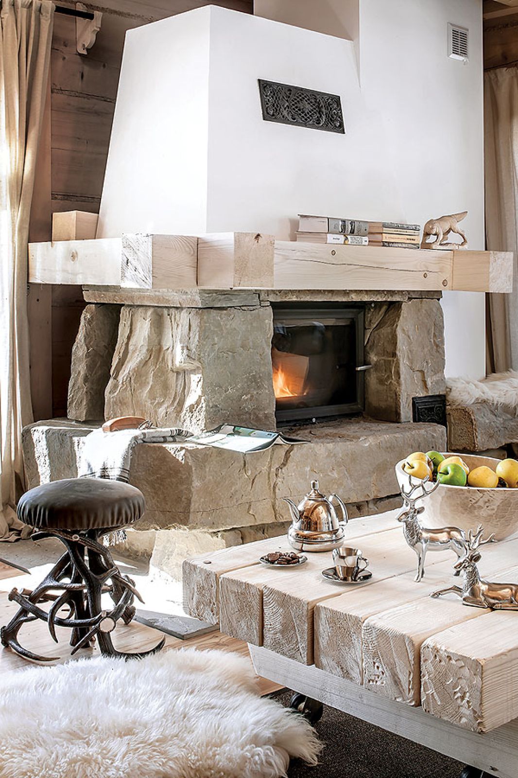 Niemal niczego tu nie kupowała, wszystko zostało ręcznie zrobione według jej projektów. W kuchni stare, wypalone słońcem deski świerkowe z firmy Regalia ubrała w ramy z polerowanego aluminium. W salonie masywne schody na giętych wangach zawiesiła na rzeźbionym sosrębie, stanowiącym też podporę belek sufitowych i kładki do jednej z sypialni. Olbrzymie górskie skały na kominek trzeba było dźwigiem wkładać do salonu w czasie budowy – wspomina architektka. – Masywne lite stoliki powstały z pni o prawie metrowej średnicy. A świerkowe komody, półki, blaty stołów i ław oraz drzwi – z drewna szczotkowanego, bo to pięknie uwydatnia usłojenie.