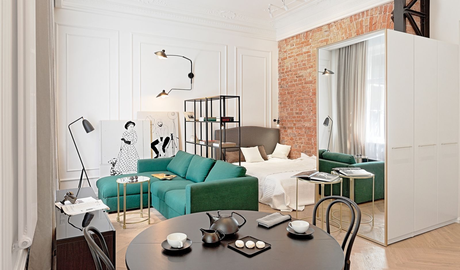 Biel, szmaragd i czerwona cegła na 34 m2 – pomysł na aranżację bardzo małej kawalerki