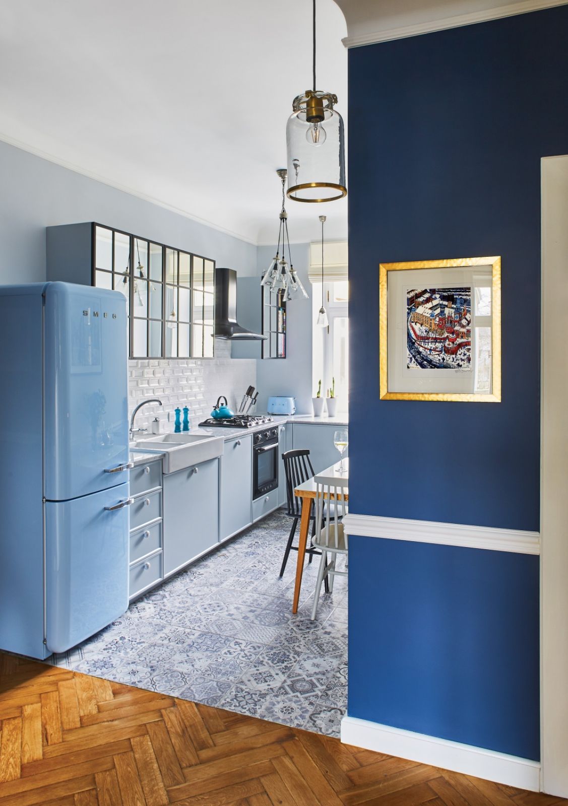 Wspólnie z córką, studentką architektury, prowadzą firmę Asjodesign i urządzają domy i mieszkania, stąd ciągle odwiedzają mnóstwo wnętrzarskich targów i wystaw. Niebiesko-żółte akcenty są niemal w każdym pokoju: fotele przed kominkiem, w korytarzu ciemny, ciepły granat, taki sam jak na zasłonach w salonie, kobaltowe krzesła w jadalni, niebieska lodówka Smeg i kuchenne szafki w odcieniu niebieskoszarym zrobione pod wymiar.
