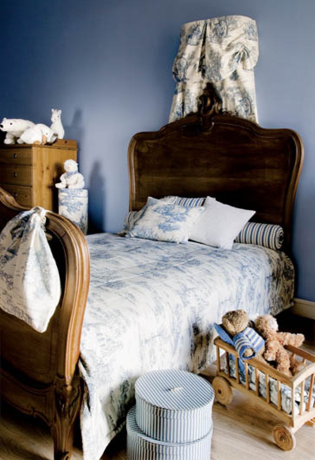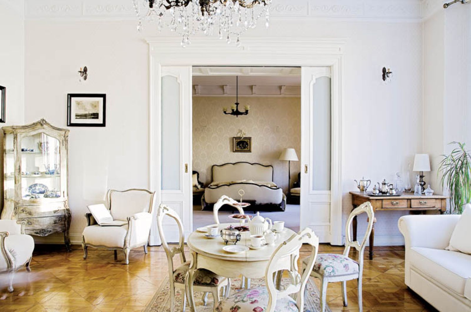 Uratowali oryginalne okna, spore fragmenty drewnianej mozaiki na podłodze, odrestaurowali przepiękne sztukaterie. Kredens w salonie i żyrandol w sypialni należały jeszcze do pierwszych właścicieli. Z pozostałymi meblami również nie mieli problemu, bo oboje są namiętnymi kolekcjonerami antyków. Poza tym Judyta ma słabość do porcelany ze scenkami rodzajowymi typu „Toile de Jouy”, a Paweł kocha dawne malarstwo holenderskie, tzw. małych mistrzów.