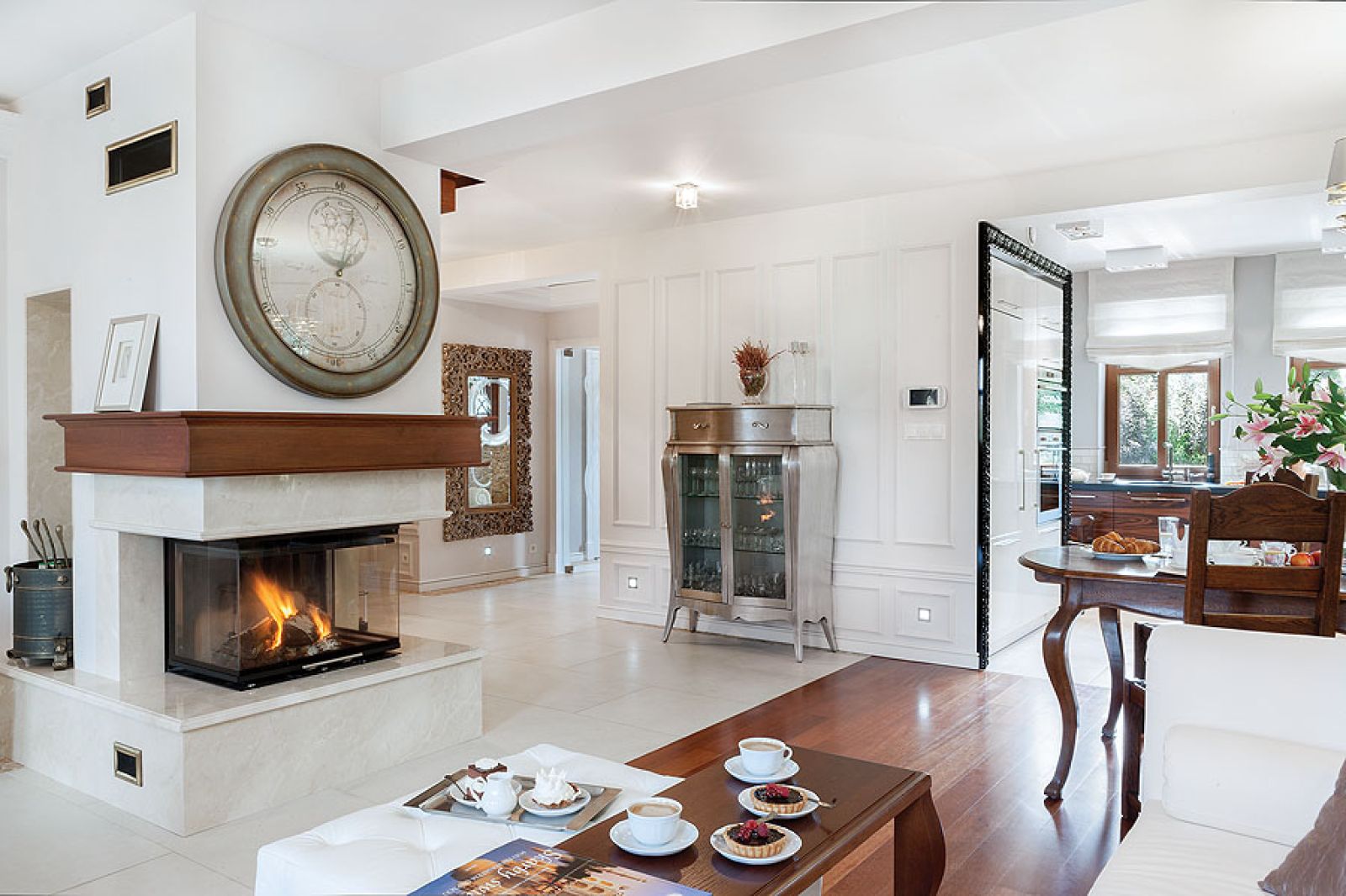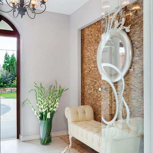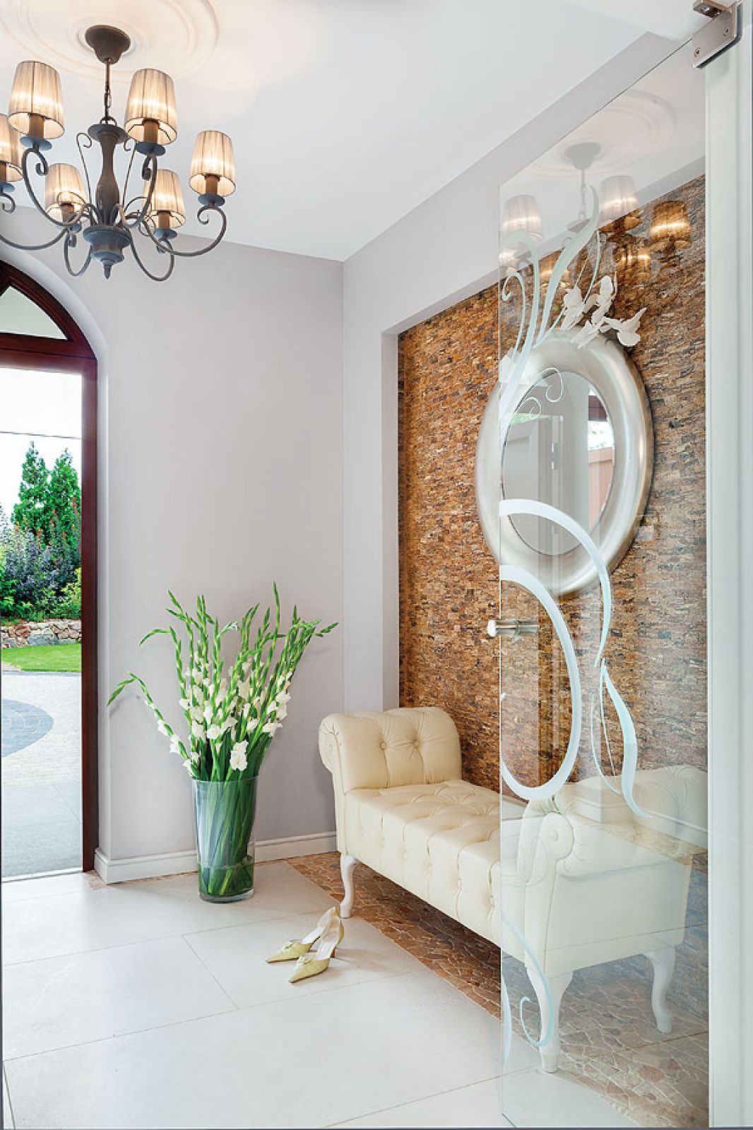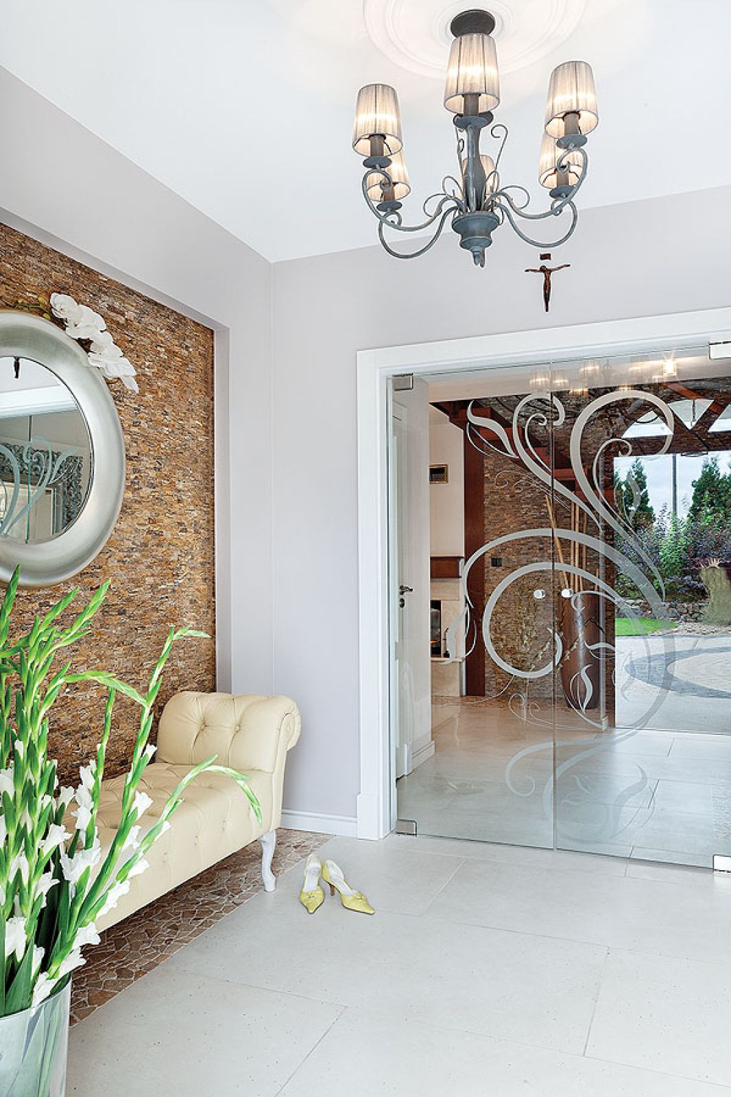Choć Jarek Jończyk woli wnętrza surowe i nowoczesne, podejmuje się wszelkich wyzwań. Grażyna i Zbyszek nie chcieli niepotrzebnej ekstrawagancji i kopiowania chwilowych mód. Miało być elegancko, przytulnie i to od pierwszego wrażenia, zaraz po przekroczeniu progu. Już w holu mamy zapowiedź tego, co czeka nas dalej. Pikowana skórzana ławeczka, srebrna rama lustra i szklane drzwi z ornamentem.
