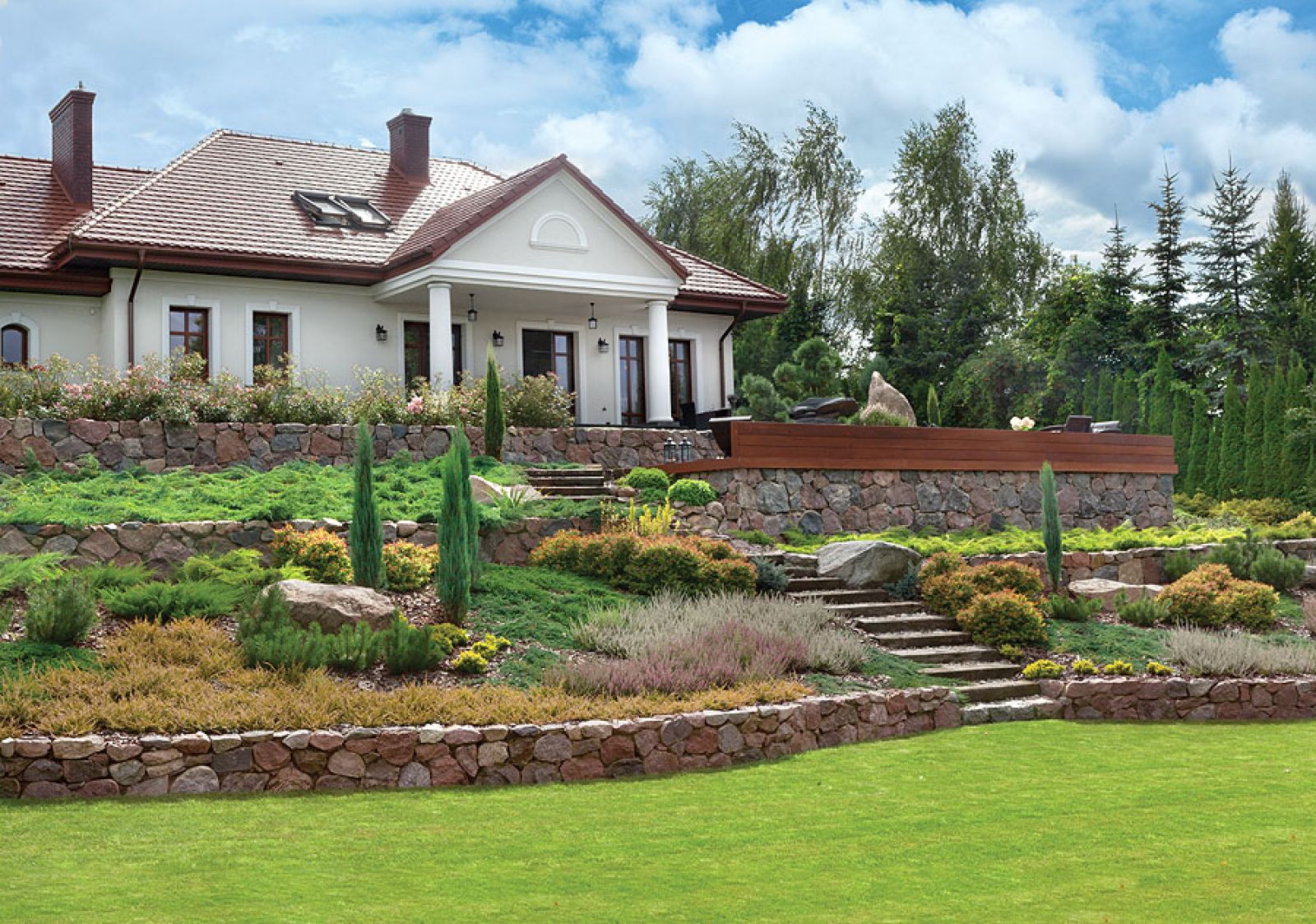 Jarek przekonał natomiast gospodarzy, żeby nie równali skarpy, lecz urządzili na niej kaskadowy ogród z tarasami wspartymi na polnych kamieniach. Na nich urządzono kameralne, domowe zakątki przypominające pokoje. Wychodząc prosto z salonu, możemy zanurzyć stopy w miękkim, zielonym kobiercu czy przysiąść na ciastko przy ogrodowej jadalni, za którą znajdziemy enklawę z kilkoma akcentami japońskimi.