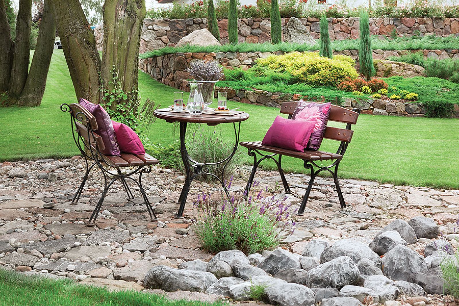 – Poranną kawę pijemy koło domu, wśród róż, rododendronów, azalii i lawendy, tu też urządzamy obiady i przyjmujemy gości – mówi Grażyna. – Na niższym tarasie leżakujemy. Garden party, pikniki i tańce przenoszą się na trzeci poziom – łąkę. Drzewa, które zasadziliśmy 10 lat temu, ładnie urosły i osłaniają nas, jakby były parawanami.