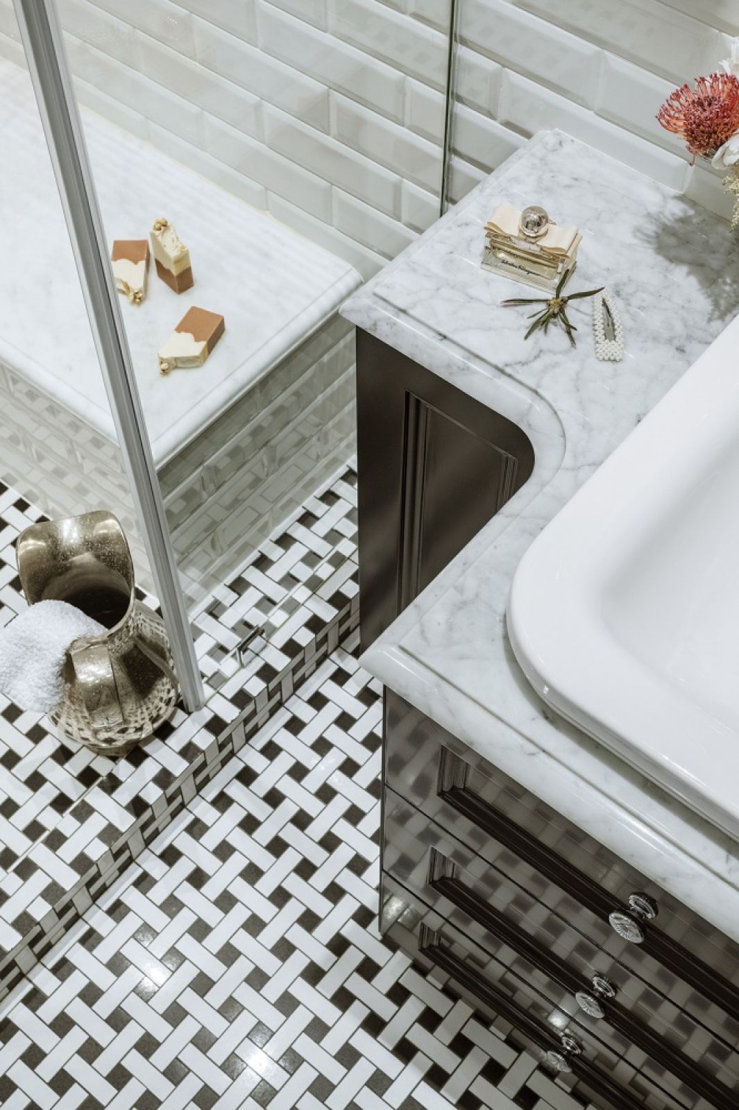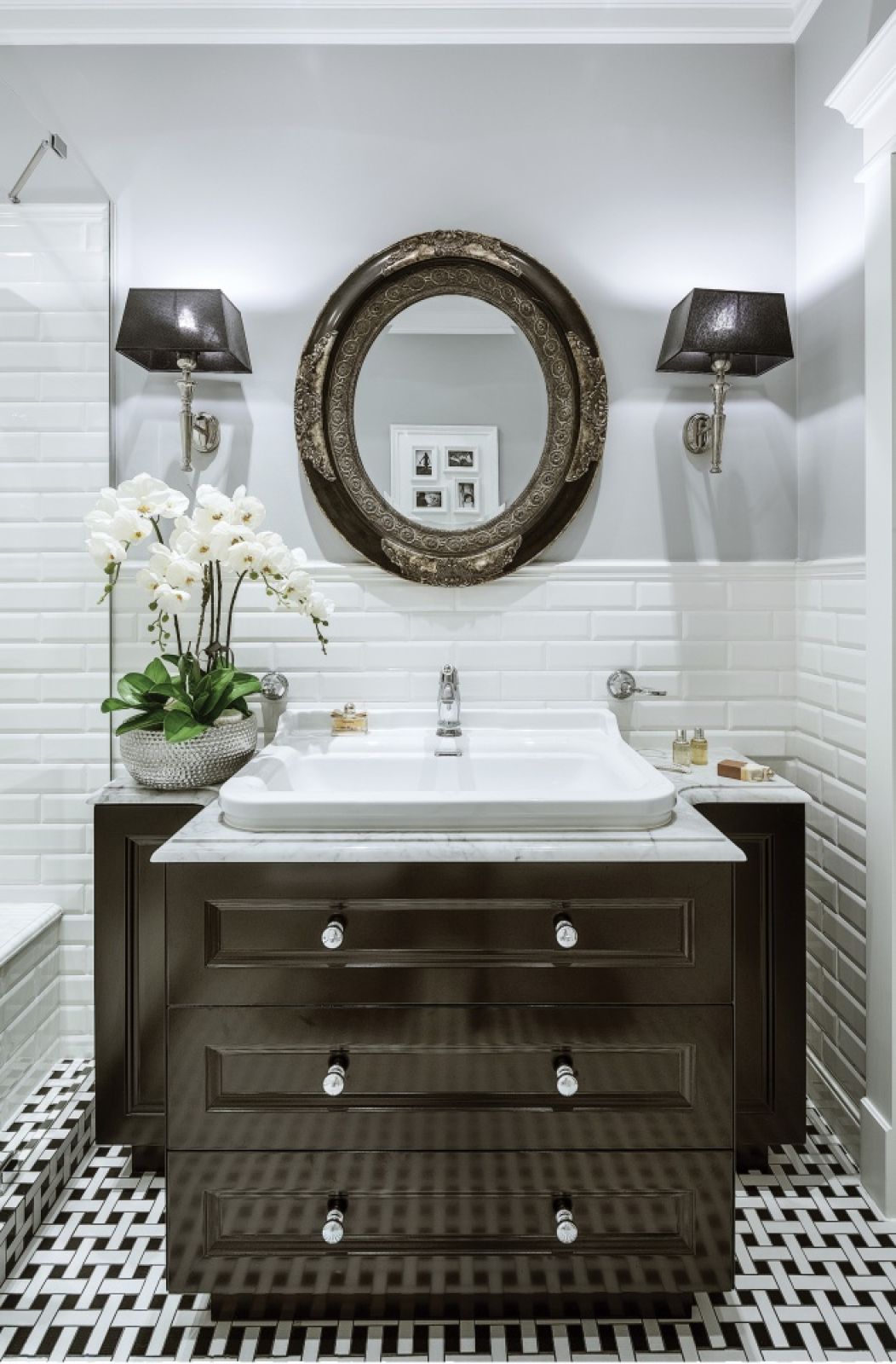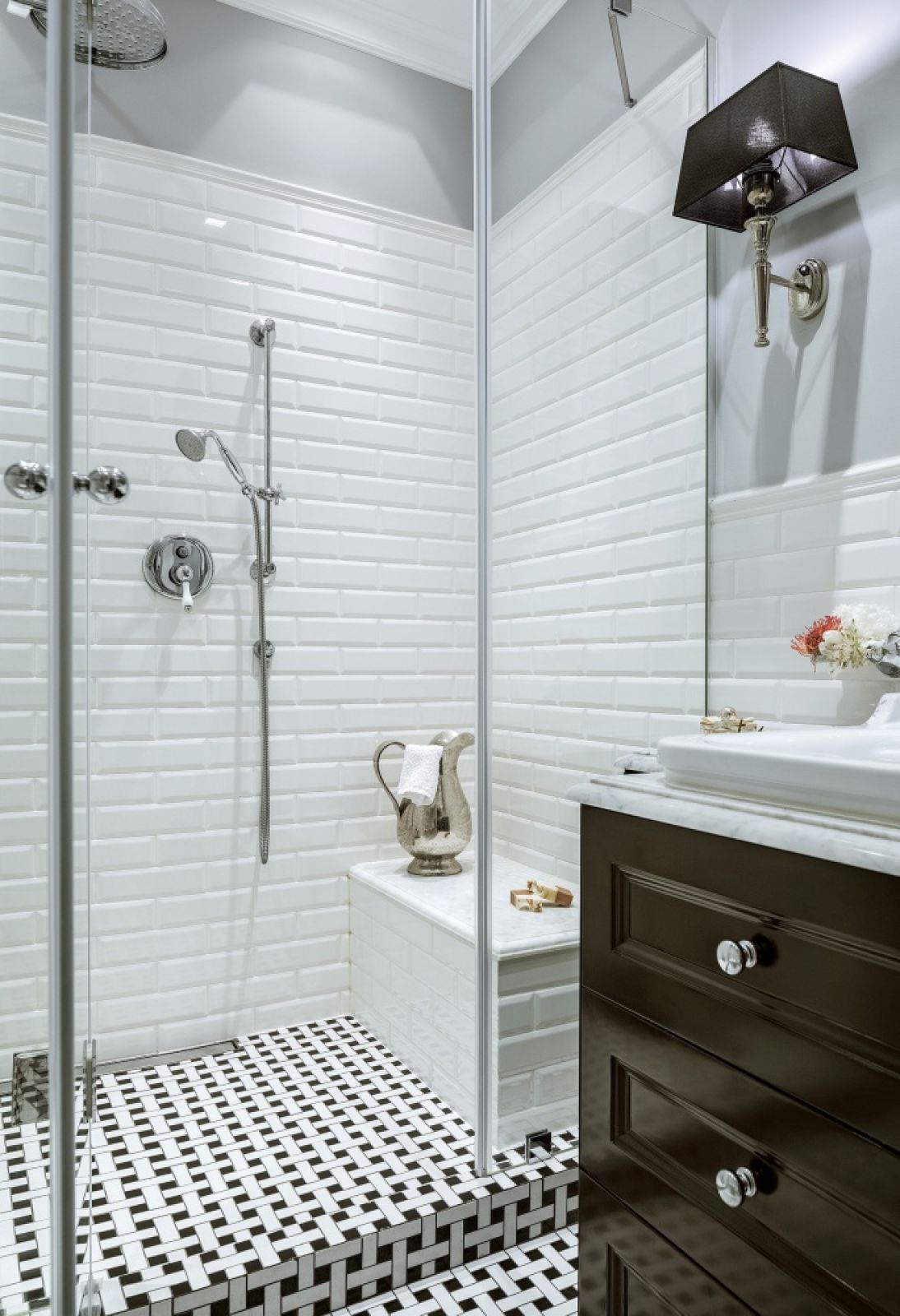 Wszystko pod ręką, bo praktyczność to ważny wyznacznik projektów Eweliny. Dobrym przykładem jest czarno-biała łazienka w stylu klasycznym. Ujmuje elegancją – nad stylową umywalką wpuszczoną w marmurowy blat wisi owalne lustro z oryginalną srebrzoną ramą. A jednocześnie jest dopasowana do potrzeb właścicielki – zamiast wanny Ewelina zaprojektowała bardzo obszerną kabinę prysznicową z wygodną ławeczką w środku.