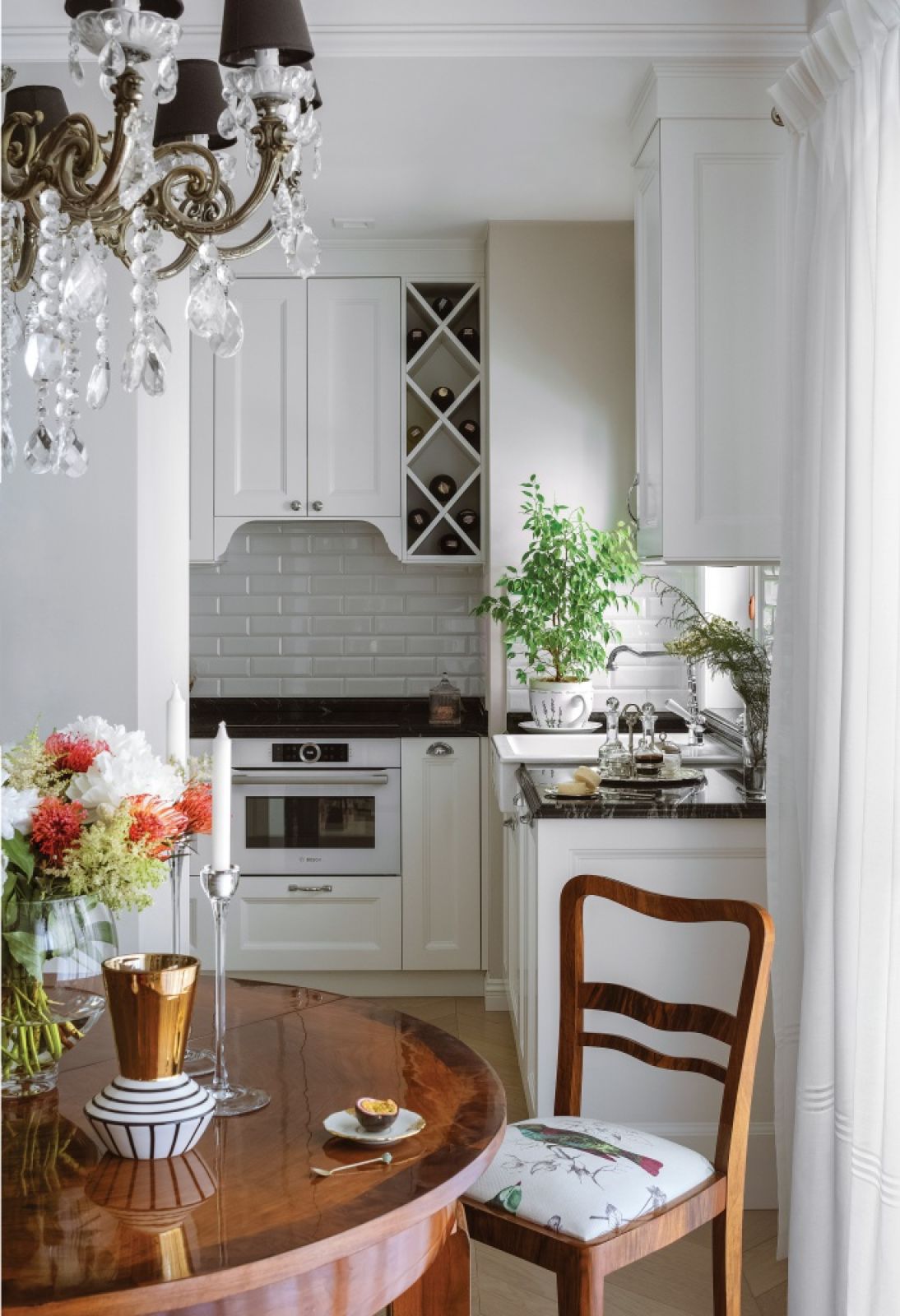 Choć 60-metrowe mieszkanie mieści się w sercu supernowoczesnego Miasteczka Wilanów, Ewelina starała się wyczarować we wnętrzu trochę przedwojennej atmosfery i nadać mu nieco rozmachu. Stąd ozdobne gzymsy pod sufitem, deska we francuską jodełkę na podłodze czy postawienie ściany oddzielającej kuchnię od salonu. – Teraz się to prawie nie zdarza – mówi projektantka – ponieważ wszyscy te ściany notorycznie usuwają, deweloperzy w nowszych budynkach już nawet nie zakładają, że one tam się pojawią. A ja nie chciałam wtłaczać mamy do takich unowocześnień. Niech tam za ścianką w spokoju sobie pichci.