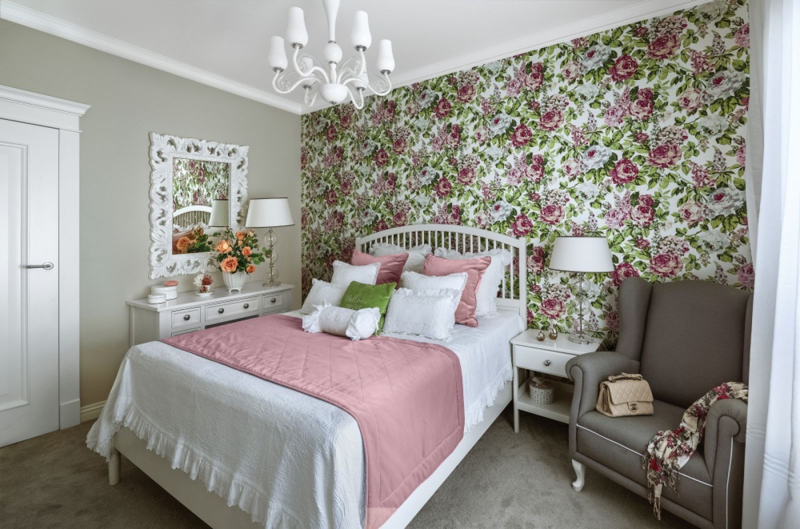 Kobieca sypialnia z tapetą w kwiaty