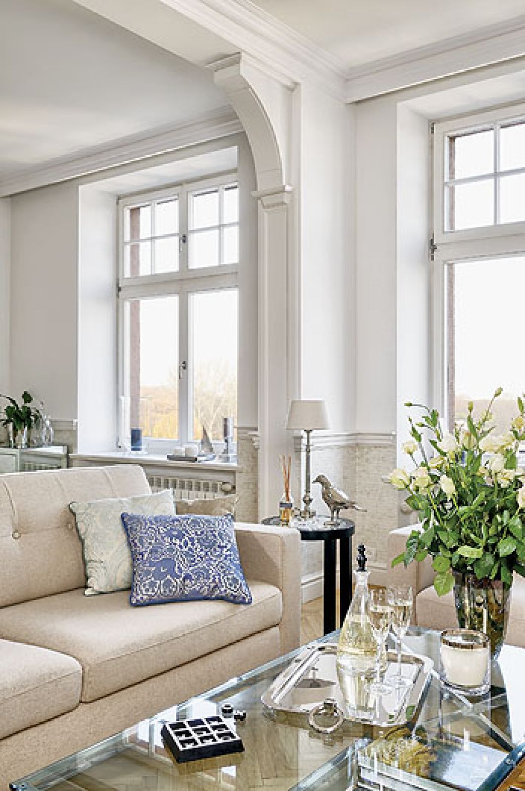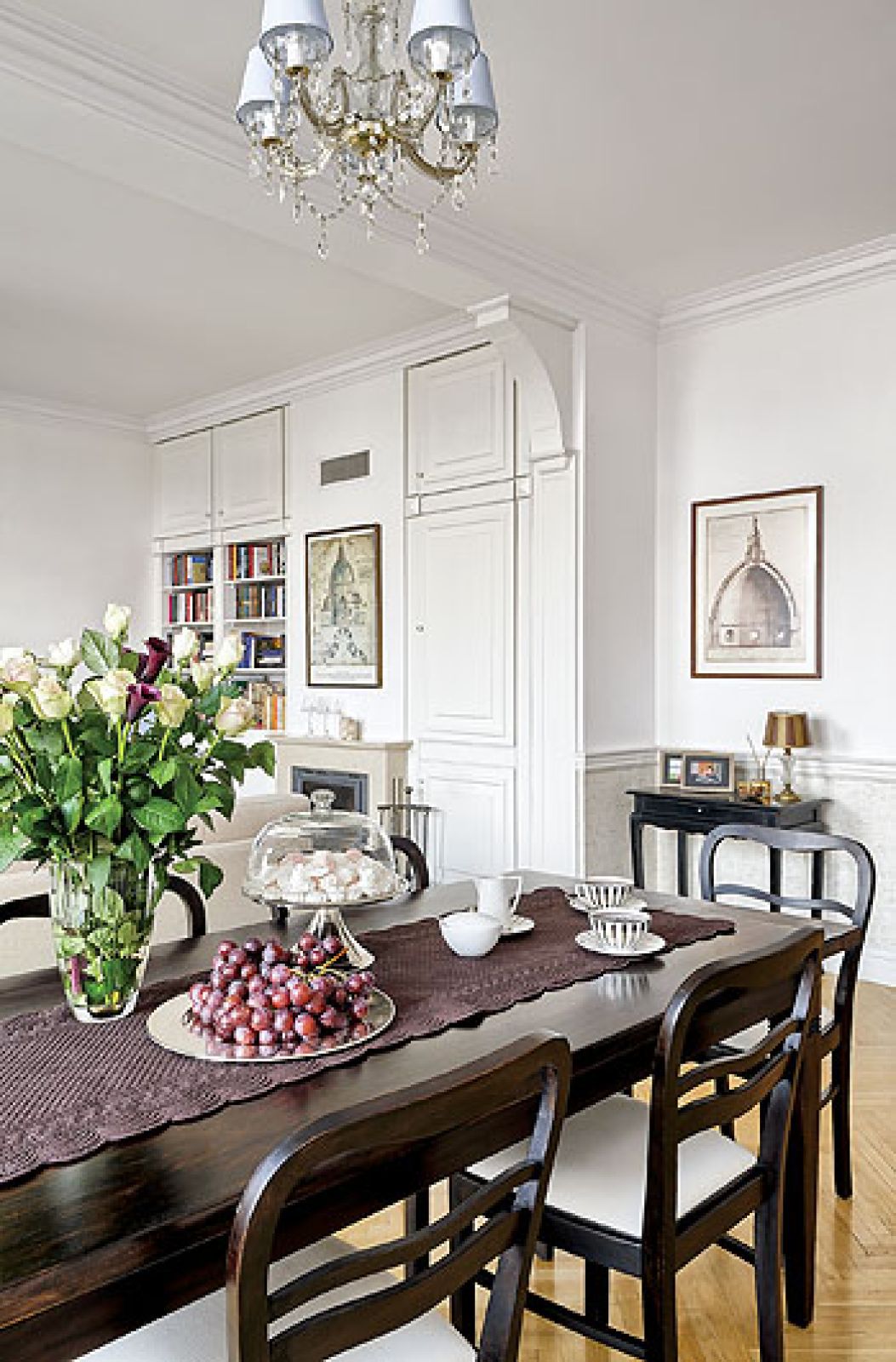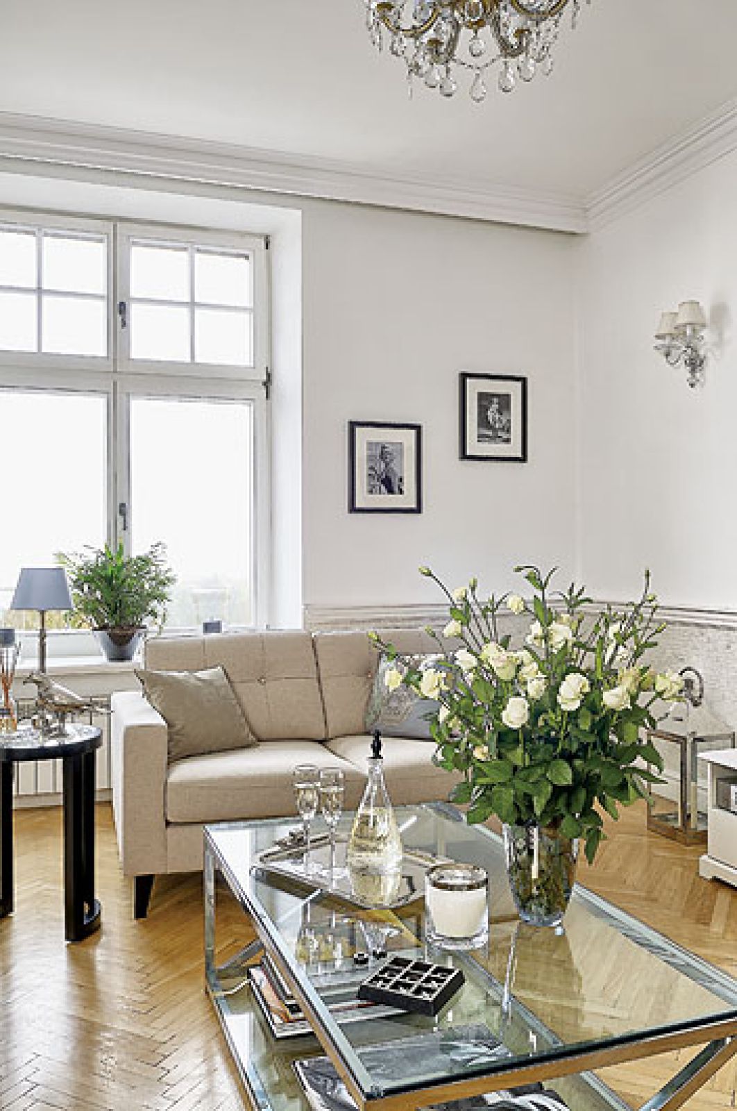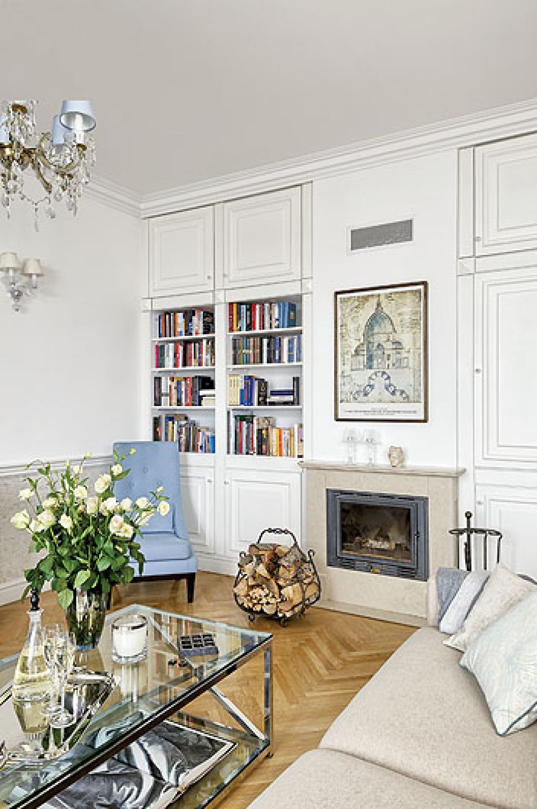 Poprzedni mieszkańcy nie odarli wnętrz z oryginalnego charakteru. Nowy właściciel postanowił tylko jeszcze bardziej go podkreślić. Zamarzył mu się mariaż klasyki i nowoczesności, czyli wszystko, co najlepsze z przeszłości przeniesione w przyszłość. Na początek zmienił kolory ścian – na chłodny lawendowy błękit. Potem meble (zostały jedynie szafki w kuchni, stół i wielkie łóżko z pikowanym zagłówkiem), by przełamać zastany styl francuski. Przydały się zbierane latami stoliki w stylu glam chic z błyszczącego forniru na chromowanych nóżkach, lustrzane komody, lśniące czarne konsole, tapicerowane gładką wełną pikowane kanapy.