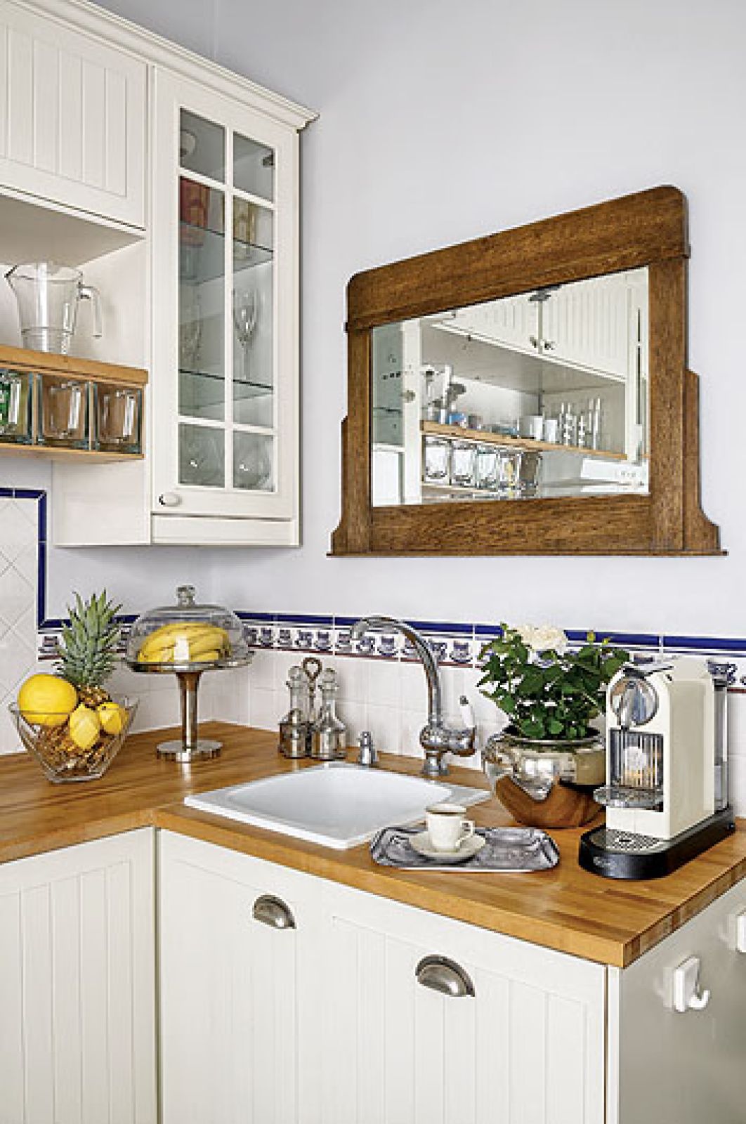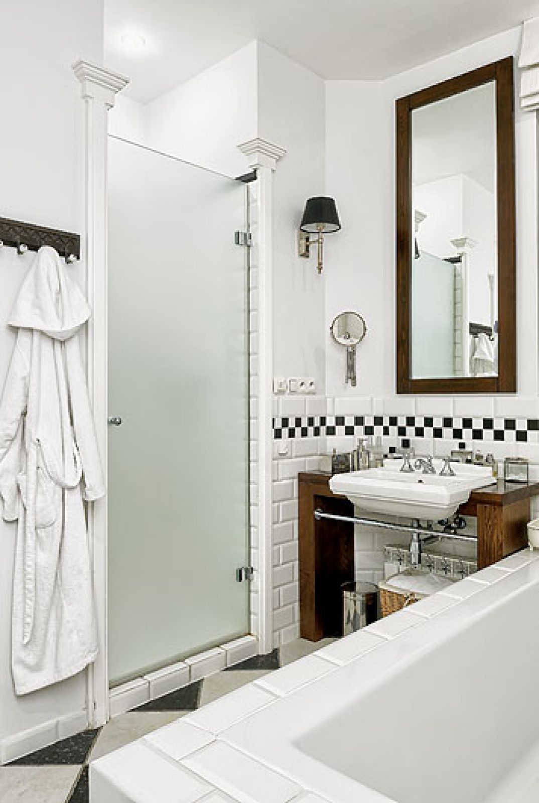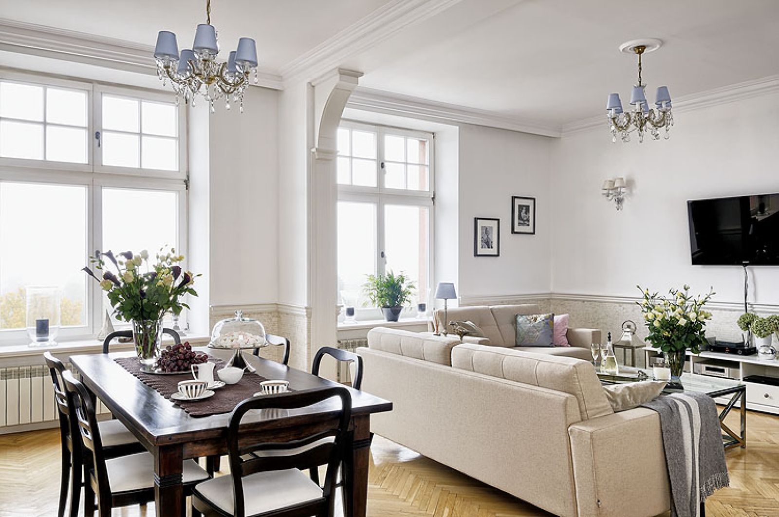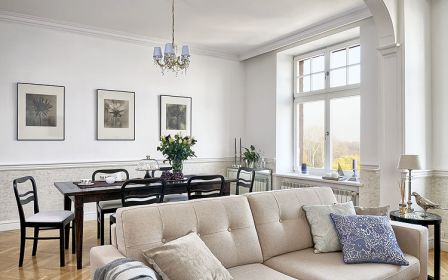Poprzedni mieszkańcy nie odarli wnętrz z oryginalnego charakteru. Nowy właściciel postanowił tylko jeszcze bardziej go podkreślić. Zamarzył mu się mariaż klasyki i nowoczesności, czyli wszystko, co najlepsze z przeszłości przeniesione w przyszłość. Na początek zmienił kolory ścian – na chłodny lawendowy błękit. Potem meble (zostały jedynie szafki w kuchni, stół i wielkie łóżko z pikowanym zagłówkiem), by przełamać zastany styl francuski. Przydały się zbierane latami stoliki w stylu glam chic z błyszczącego forniru na chromowanych nóżkach, lustrzane komody, lśniące czarne konsole, tapicerowane gładką wełną pikowane kanapy.