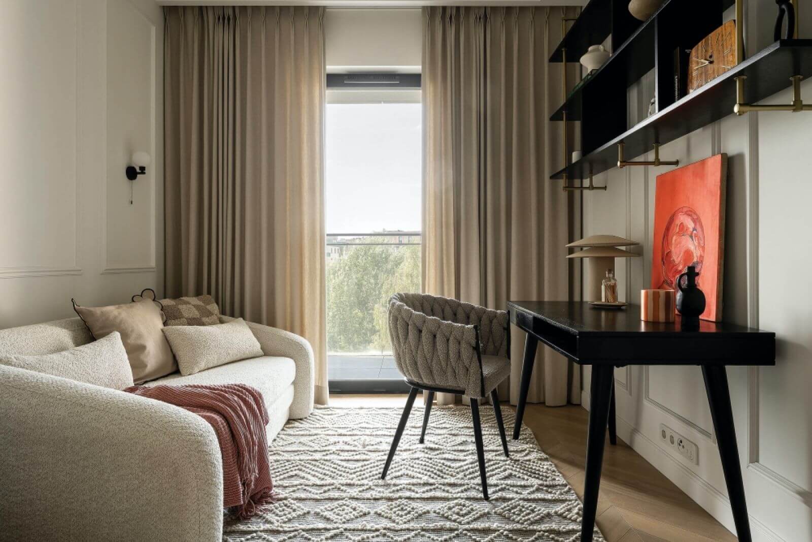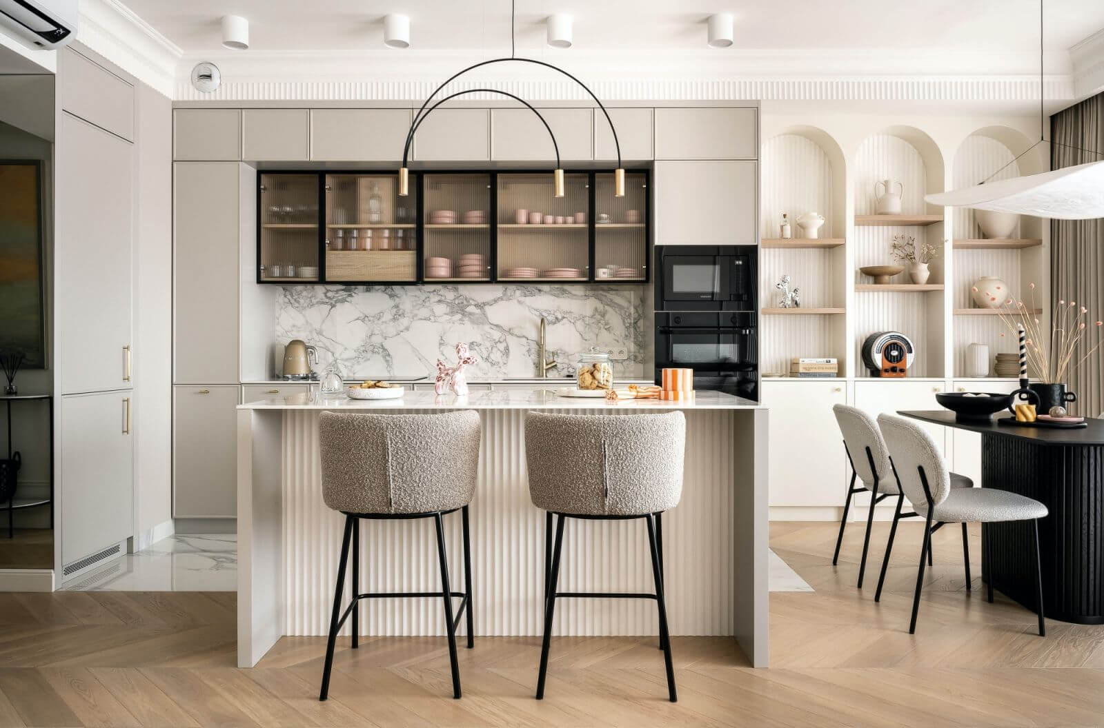 Pionowe linie są dyskretne, choć pojawiają się w wielu miejscach – na ścianach, meblach, frontach kuchennych witrynek. No i łuki – dziś modne, ale wtedy, trzy lata temu, jeszcze nie były tak popularne. Architektki wykończyły nimi półki w salonie, tworząc efektowne nisze na książki i dekoracyjne bibeloty.