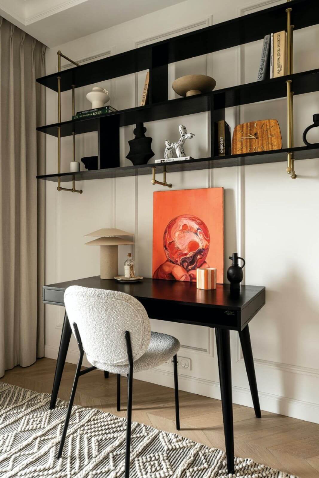 Pomysłowe rozwiązania we wnętrzach: efektowne nisze na książki, ryflowania na ścianach i meblach, wnęka z czarną opaską
