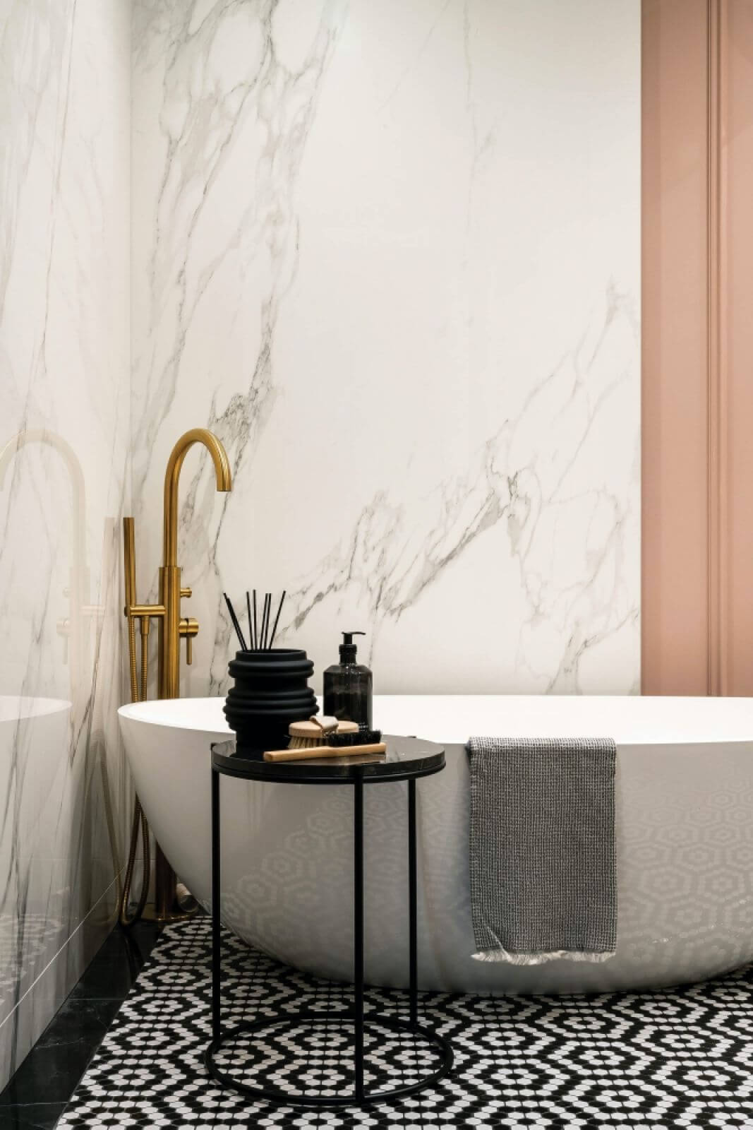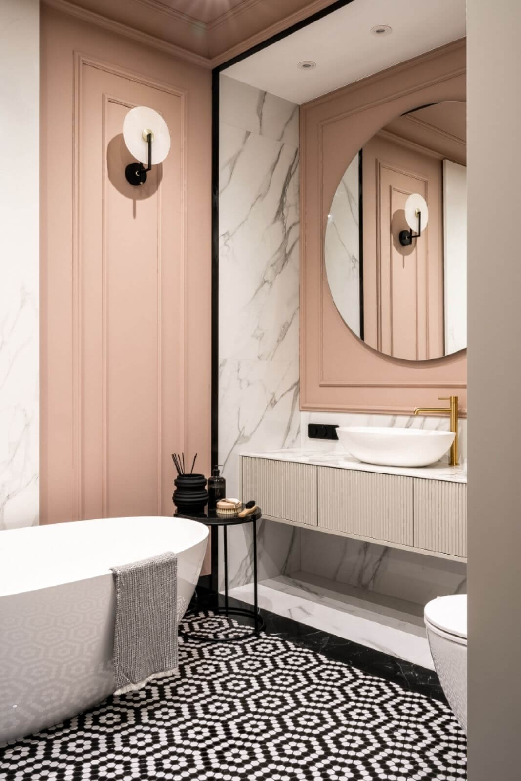 Klasycznego sznytu dodają sztukaterie – są nawet w łazience, pomalowane na wdzięczny pudrowy róż (jak ten na lukrowanych ciasteczkach z rodzinnej cukierni). Takich słodkich akcentów jest tutaj więcej – pastelowe odcienie pojawiają się głównie na tekstyliach i dodatkach, pięknie ożywiając subtelną kolorystykę. – Jest też trochę matowego złota – mówi Julia. Nie chciałam, żeby błyszczało, a jedynie delikatnie rozświetlało przestrzeń. Światło jest tu bardzo ważne – nastrojowe, kameralne – rozbłyskuje z biżuteryjnych kinkiecików, miękko wypływa spod rantów marmurowych tafli.