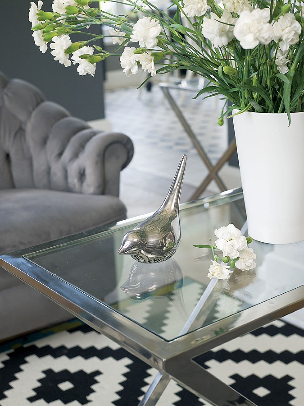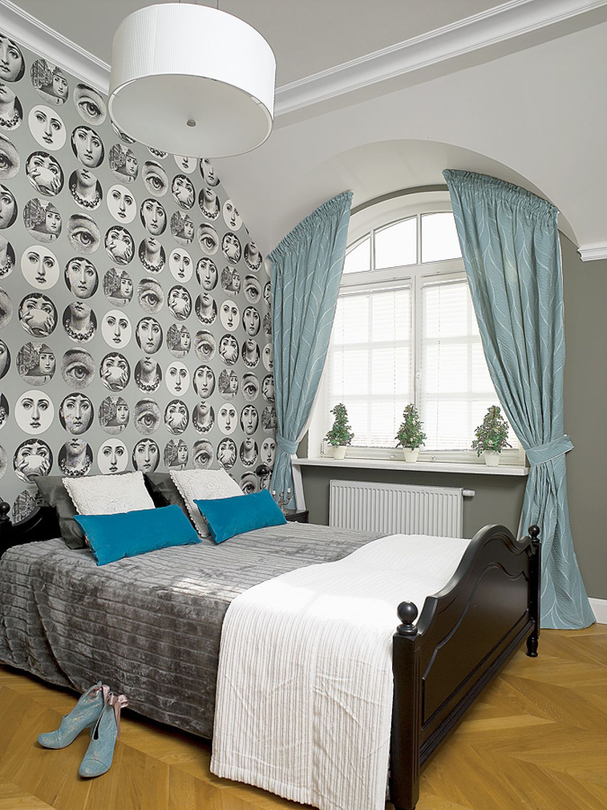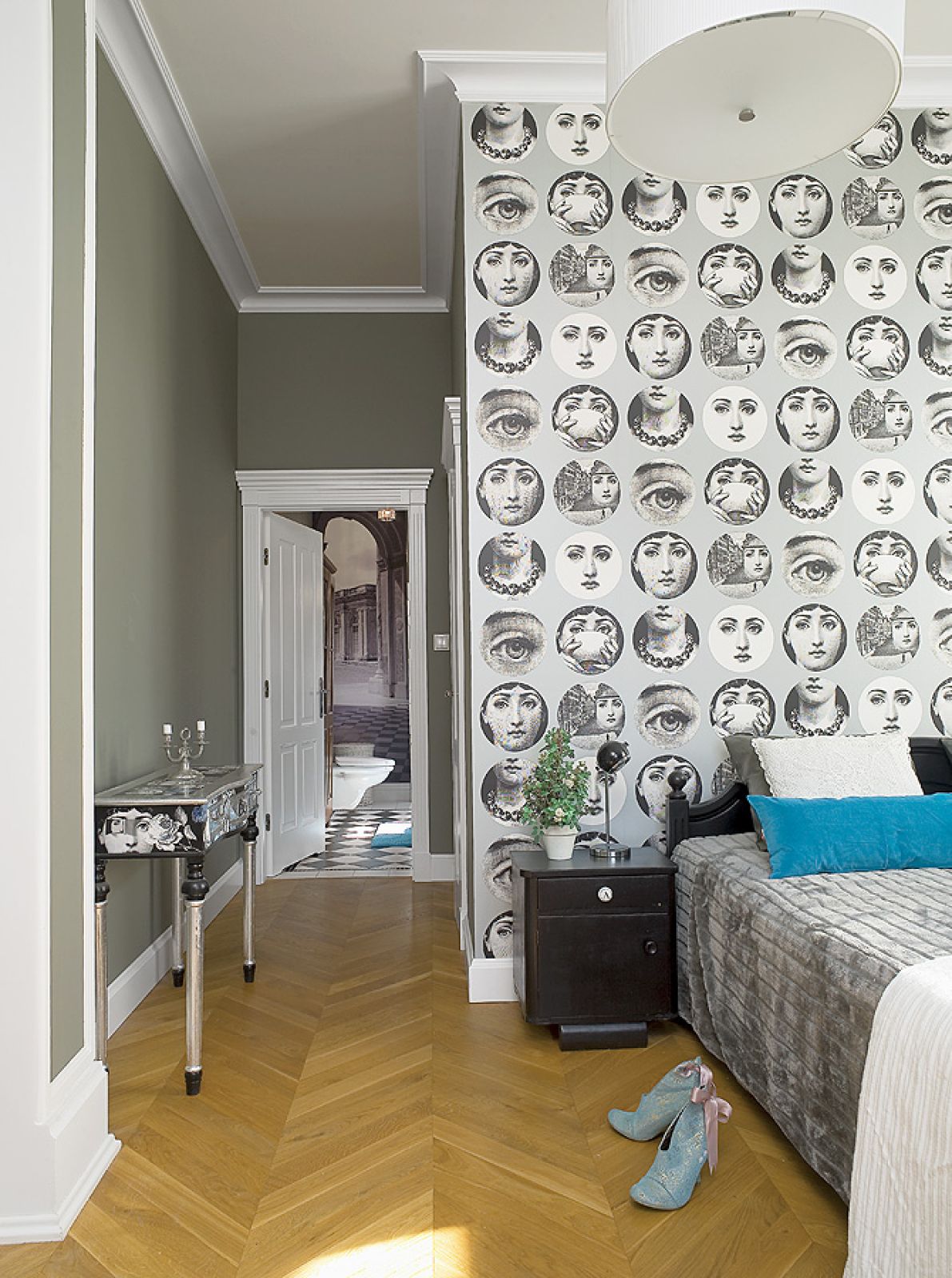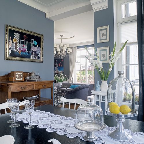 Przedstawiają Latający cyrk Katarzyny Pander. Szalony, surrealistyczny świat jak z Monty Pythona: panowie w melonikach, różowe flamingi, gigantyczne turkusowe róże, postacie z cyrku albo komedii dell’arte i obowiązkowo szachownice – bo czerni i bieli musi być zawsze po równo, tak samo jak dobra i zła. Kolażami ozdabia meble, maluje też jedwabne apaszki (www.jedwabnie.blogspot.com), a także projektuje i urządza wnętrza. Kiedy przyszła pora na własny dom, artystyczna pasja bardzo się przydała.