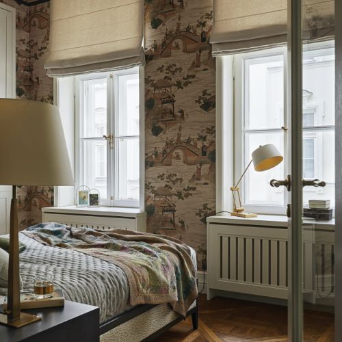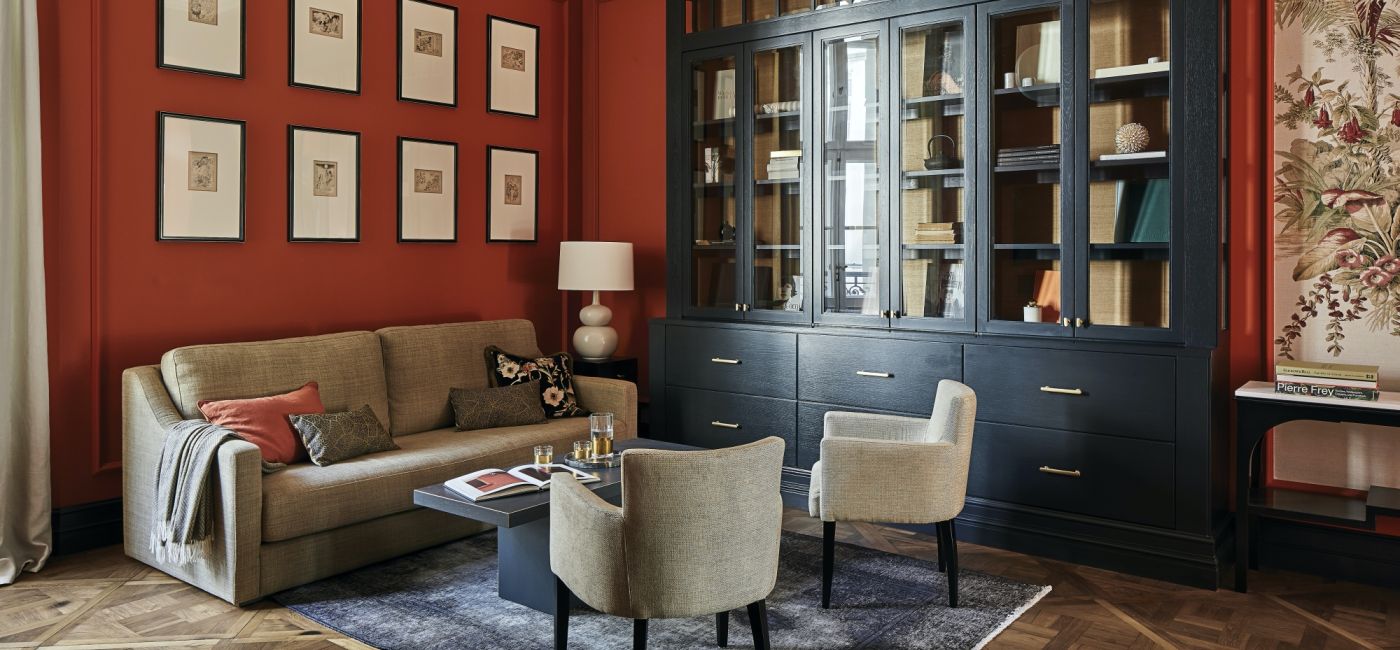 Pomarańczowy odcień czerwieni z koralowym podtonem, dominujący w tym apartamencie, to kolor, który powstał ku czci… ognistych włosów Charlotte, dyrektor kreatywnej firmy Farrow & Ball, która wymyśla kolory farb i schematy kolorystyczne dla firmy. Założyciel marki zwykł mawiać: „Farba jest jak kawa. Kolor to pianka na jej wierzchu, ale o dobrym smaku decyduje jakość całej zawartości filiżanki”. Dlatego dom pomalowany dobrą farbą jest smakowity.