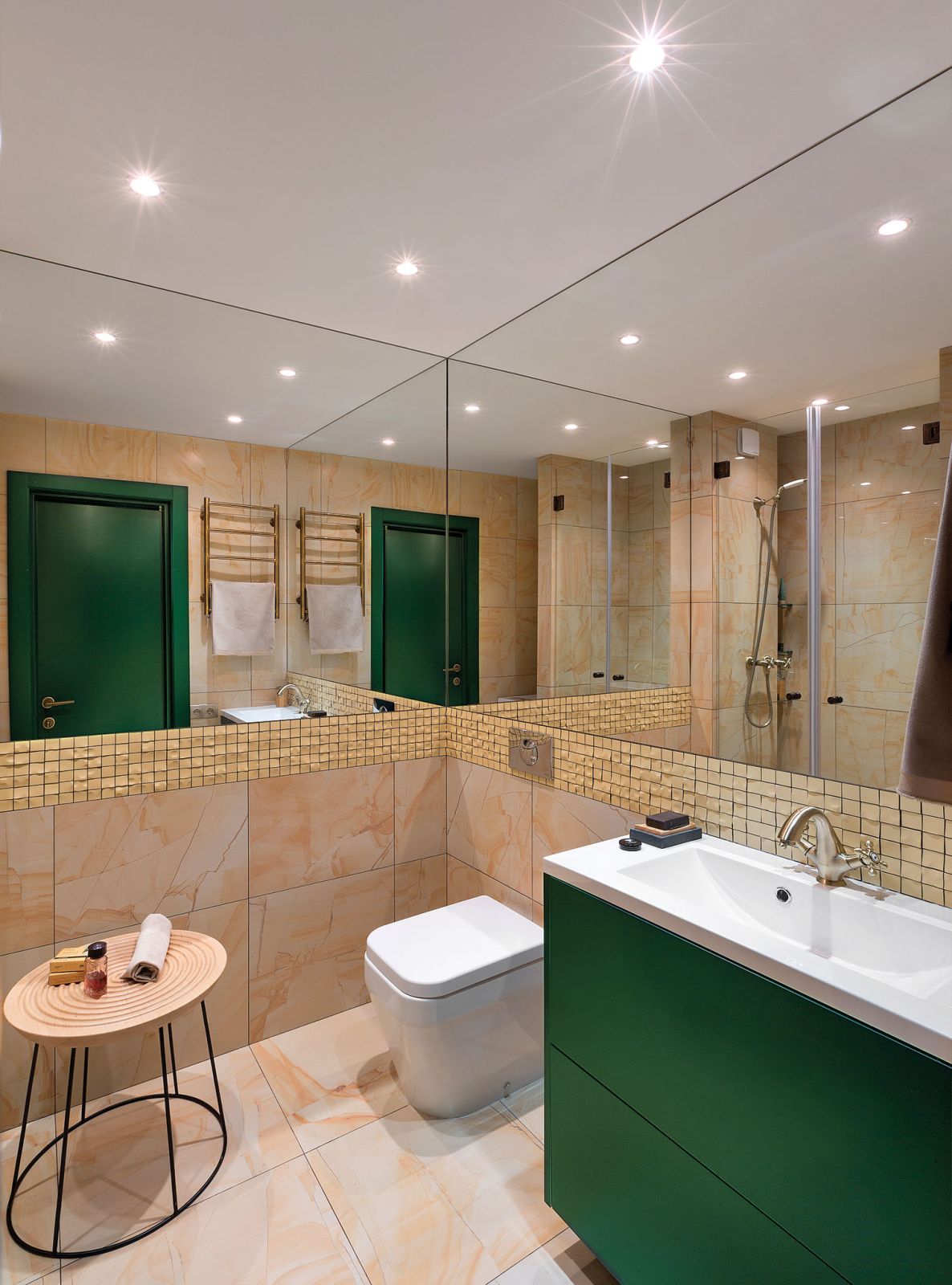 Lustra, których Elena jest nieskrywaną wielbicielką, trafiły także na dwie sąsiadujące ściany w łazience, dzięki czemu z maleńkiego pomieszczenia zrobił się niemal pokój kąpielowy. To taka magia osiągnięta przy użyciu szkiełka i oka.