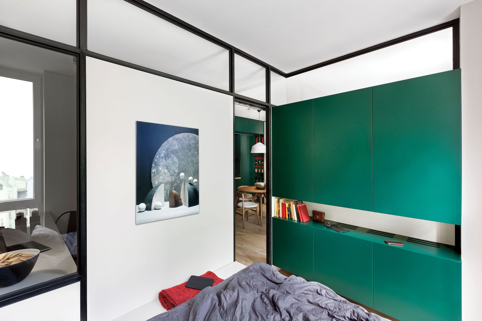 Aż dziw bierze, że ukraińska projektantka w tak małym mieszkaniu zmieściła salon, kuchnię, jadalnię, sypialnię, miejsce do pracy, a nawet osobną garderobę! I trzeba jej to oddać – walczyła o każdy milimetr. Wpadła też na pomysł, żeby to, co dzieli przestrzeń, wyglądało jak meble. Na przykład kuchnia jest monochromatyczna i wtopiona w rozległą niszę, a miejsce snu to biały box z przesuwnymi drzwiami prawie w całości wypełniony łóżkiem.