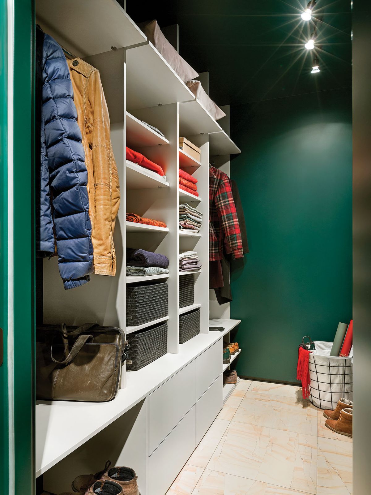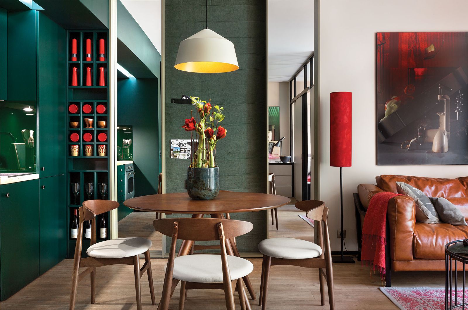 Z niedużego mieszkania Elena zrobiła prawdziwy apartament. Użyła przy tym kilku cennych sztuczek, które go optycznie powiększyły. Najważniejsza to podzielenie wnętrza kontrastowymi kolorami. Jedna część – hol i kuchnia (ściany razem z meblami) – zanurzona jest w ciemnym, głębokim turkusie, zaś salon i sypialnia toną w bieli i świetle. Poprzez ten kontrast obie części niejako oddalają się od siebie, rozciągają.