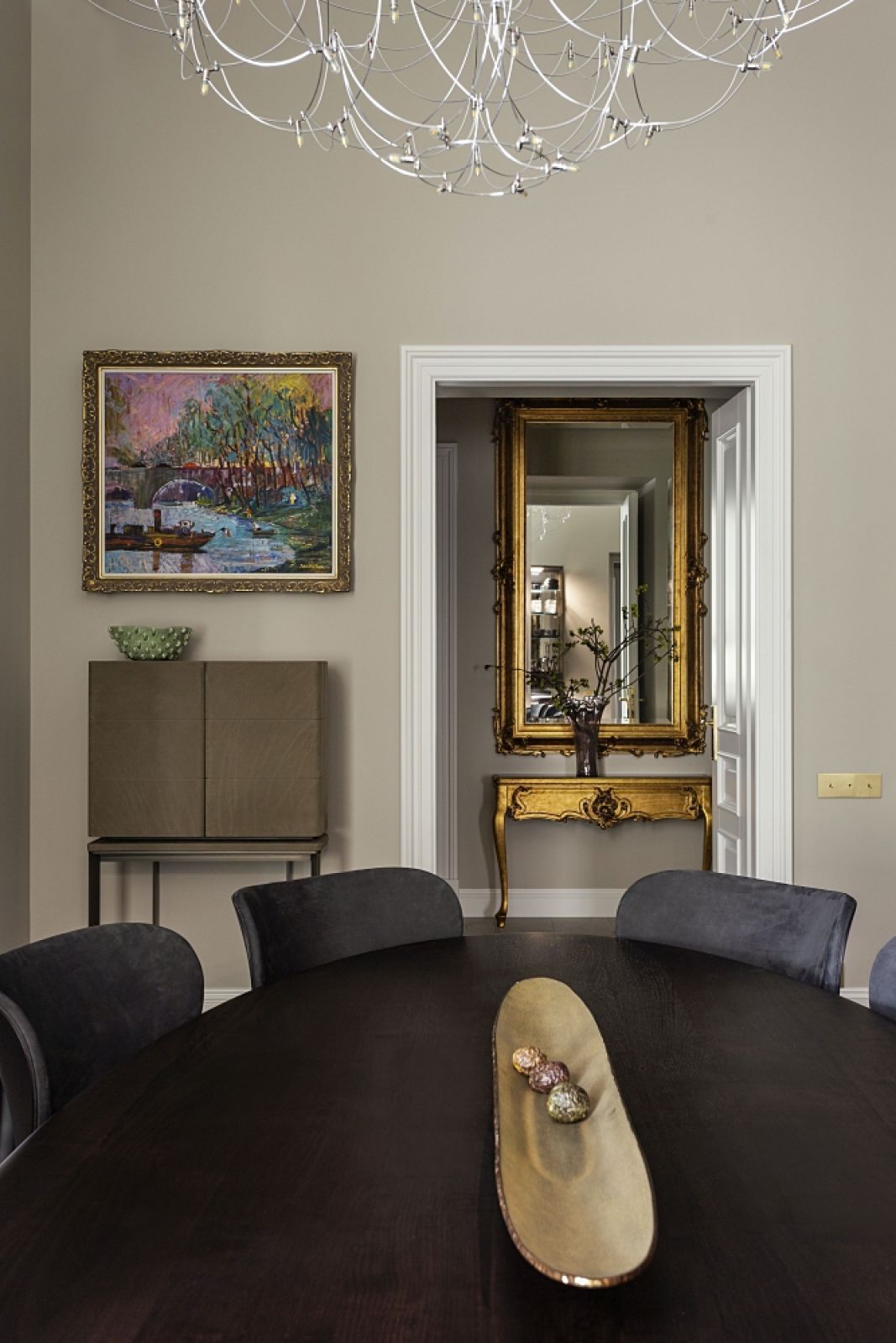 Historyczny kontekst wnętrza podkreślają żyrandole ze szkła Murano projektantki Patrizii Volpato. Uwagę zwracają też lampy wiszące Baxter Q2, które kaskadowym kształtem nawiązują do pałacowych żyrandoli. Miękka sofa projektu Paoli Navone oraz złote dodatki w postaci stolików kawowych i regału pięknie kontrastują z obrazem Leona Tarasewicza. Kuchnię SieMatic dopełniają natomiast meble Baxter oraz sztuka Jana Szancenbacha, przedstawiciela koloryzmu.