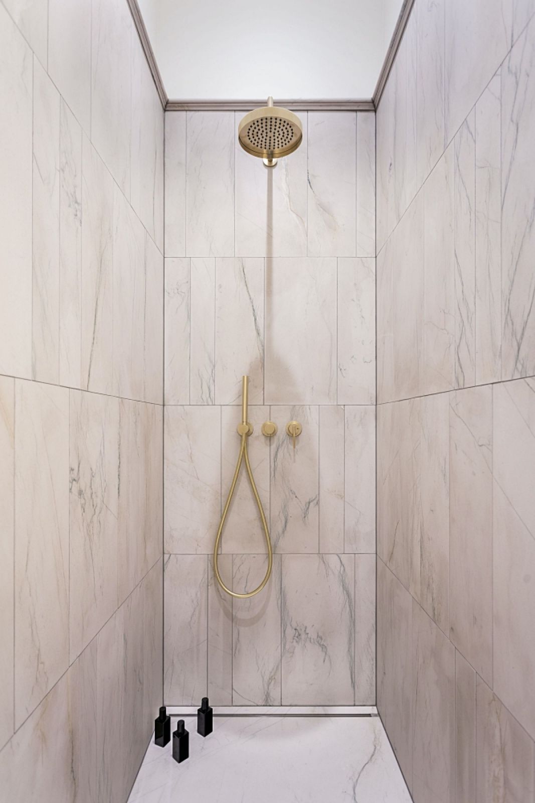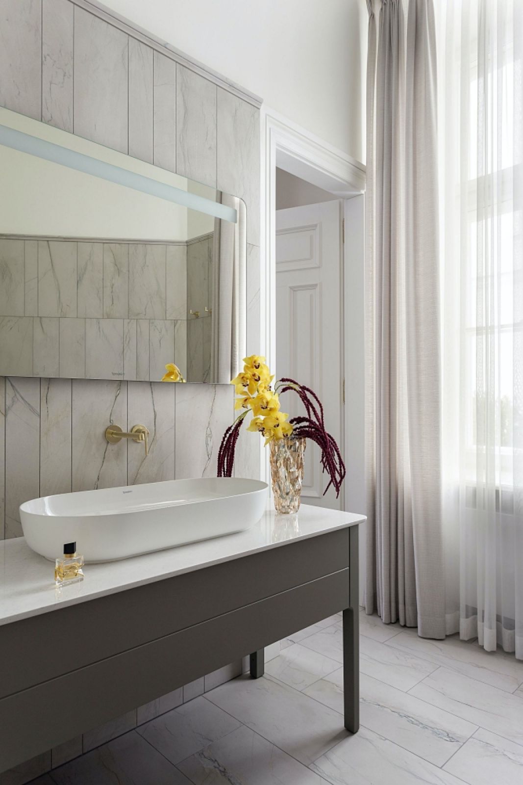 W łazienkach dominuje prostota. Kwarcyt w modułowych płytach ułożono w nieregularny sposób. Aranżację przestrzeni dopełniają dodatki oraz armatura marki Gessi z szampańskiego złota. Nie zabrakło tu sztuki w postaci płaskorzeźby Igora Dobrowolskiego i plafonier ze szkła Murano. W każdym rogu tego apartamentu kryje się historia złożona z precyzyjnie dobranych elementów, które razem tworzą harmonijną i intrygującą całość.