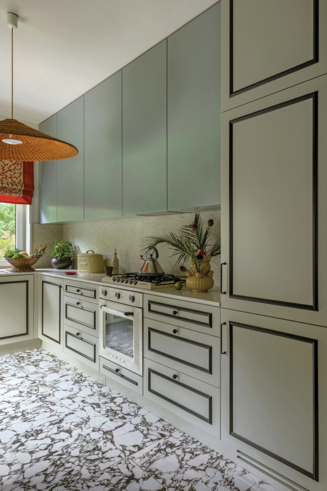 Zabudowa kuchenna też jest projektu Kamili. Ciągi szafek różnią się od siebie. Dolne wraz z jednym słupkiem to szałwiowe meble z czarną ozdobną listwą, nawiązującą kolorem do czarno-białej podłogi. Ciąg górnych szafek z kolei jest bladobłękitny, bezuchwytowy i sięga do samego sufitu. – Wybrałam takie rozwiązanie, żeby kuchenne osady, na przykład drobinki tłuszczu rozpylającego się podczas smażenia, nie zostawały na meblach. Poza tym poprowadzenie szafek pod sam sufit znacznie zwiększa przestrzeń do przechowywania.
