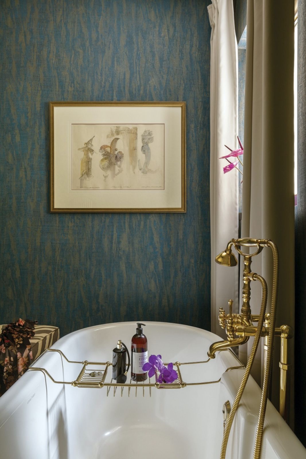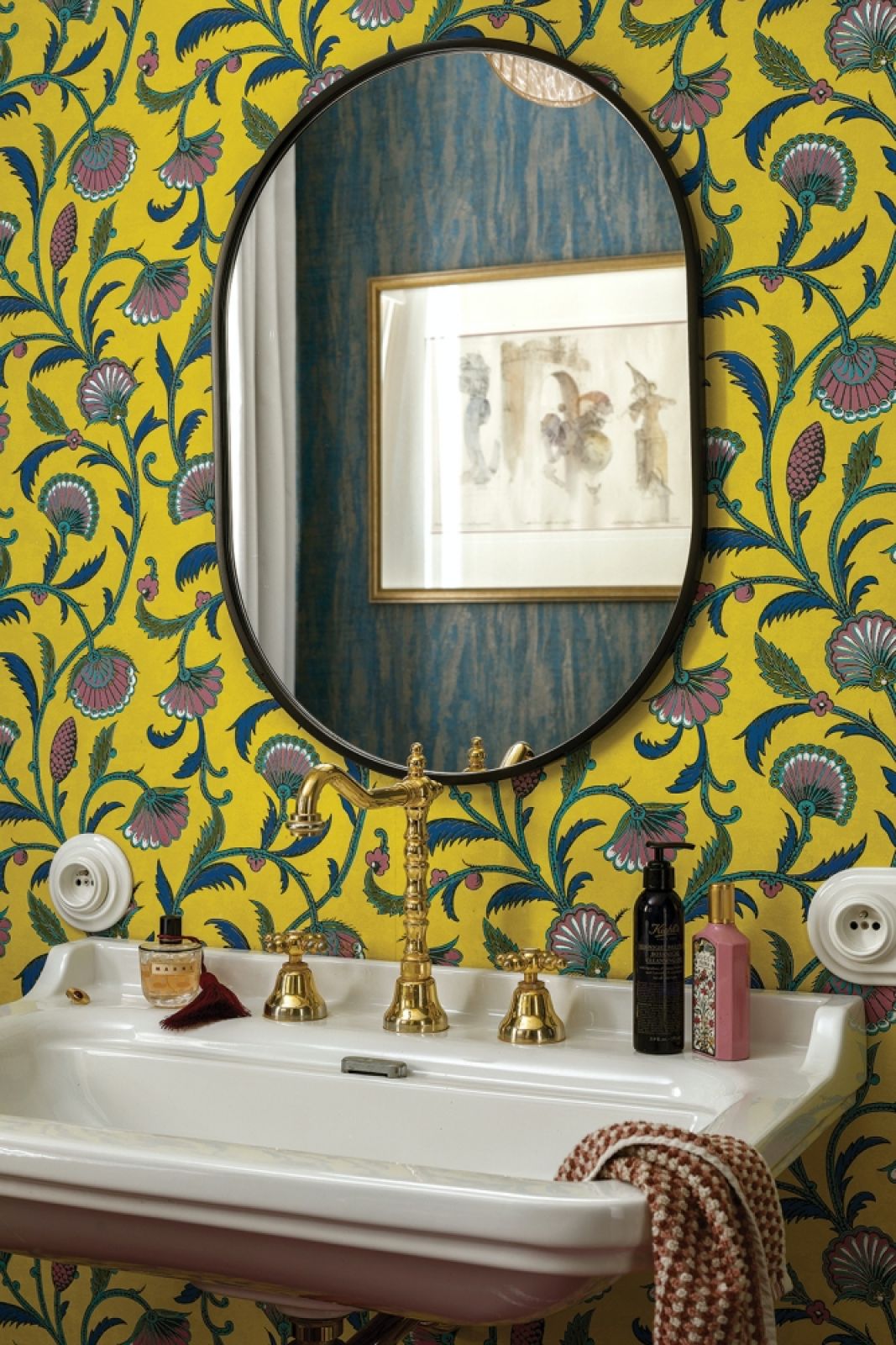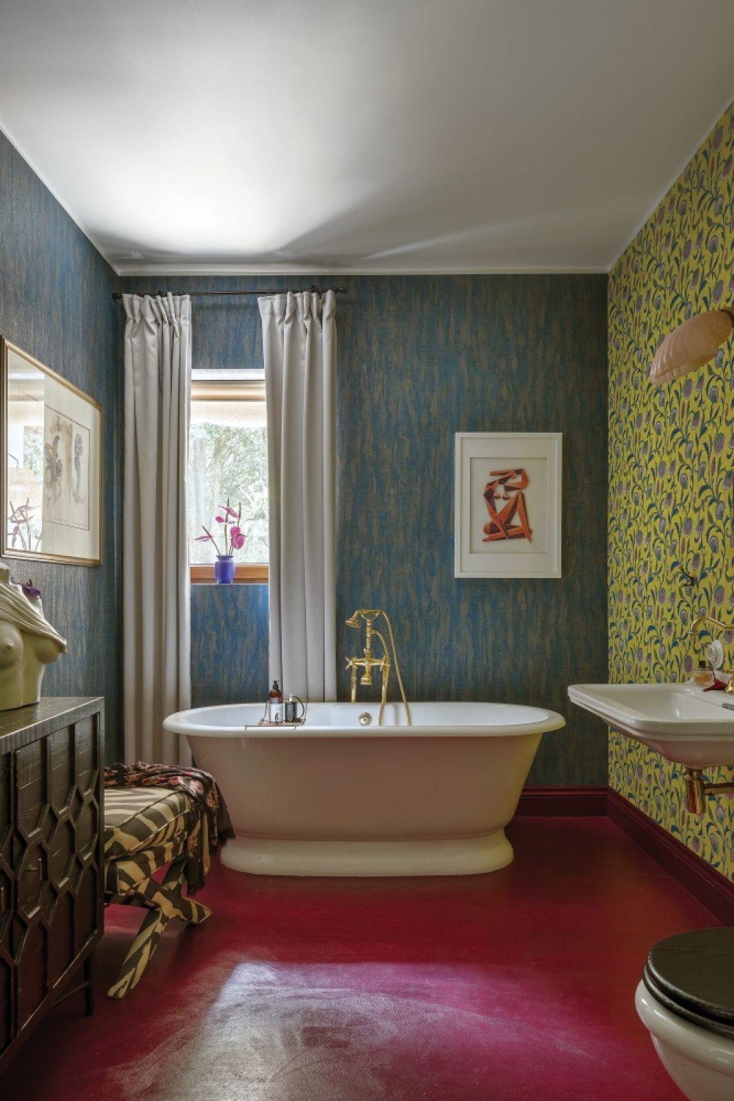 Także łazienka przypomina paletę malarską – mamy tutaj buraczkową podłogę, dwie całkiem różne tapety: kanarkową i niebieską, a do tego kolorowe dzieła sztuki na ścianach.