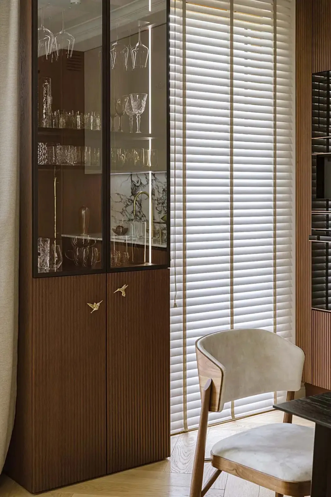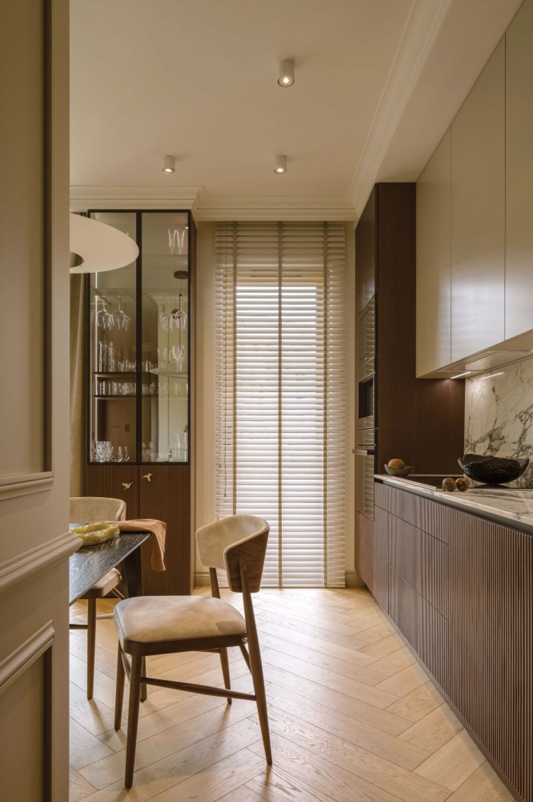 Styl wnętrza – efekt wspólnej pracy Doroty i Patrycji – to eklektyzm z dominantą klasyki. Powstała stylowa baza ze sztukateriami na ścianach, specjalnie zaprojektowanym portalem kominkowym, zdobnymi gzymsami na styku sufitów i ścian. Przełamuje ją nowoczesny twist: kilka współczesnych mebli, designerskich lamp i parę modnych rozwiązań, jak na przykład ryflowane fronty z naturalnego, zabejcowanego na ciemny brąz drewna czy efektowne szklano-metalowe drzwi.