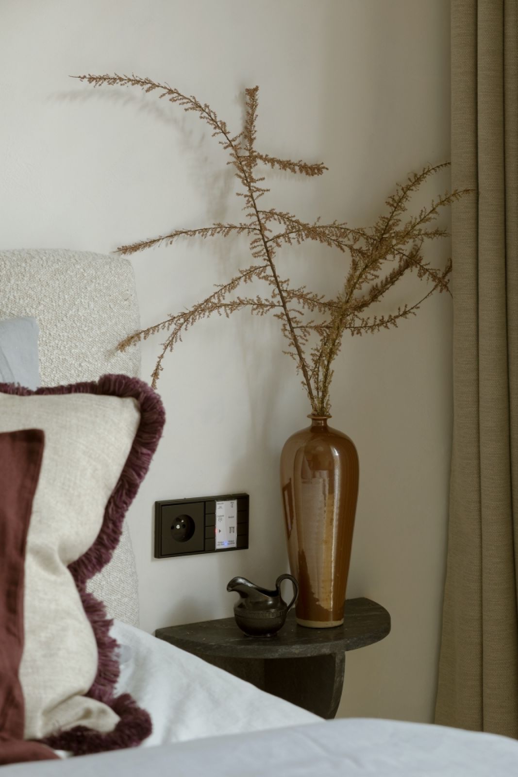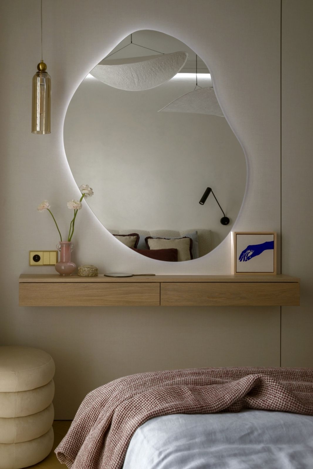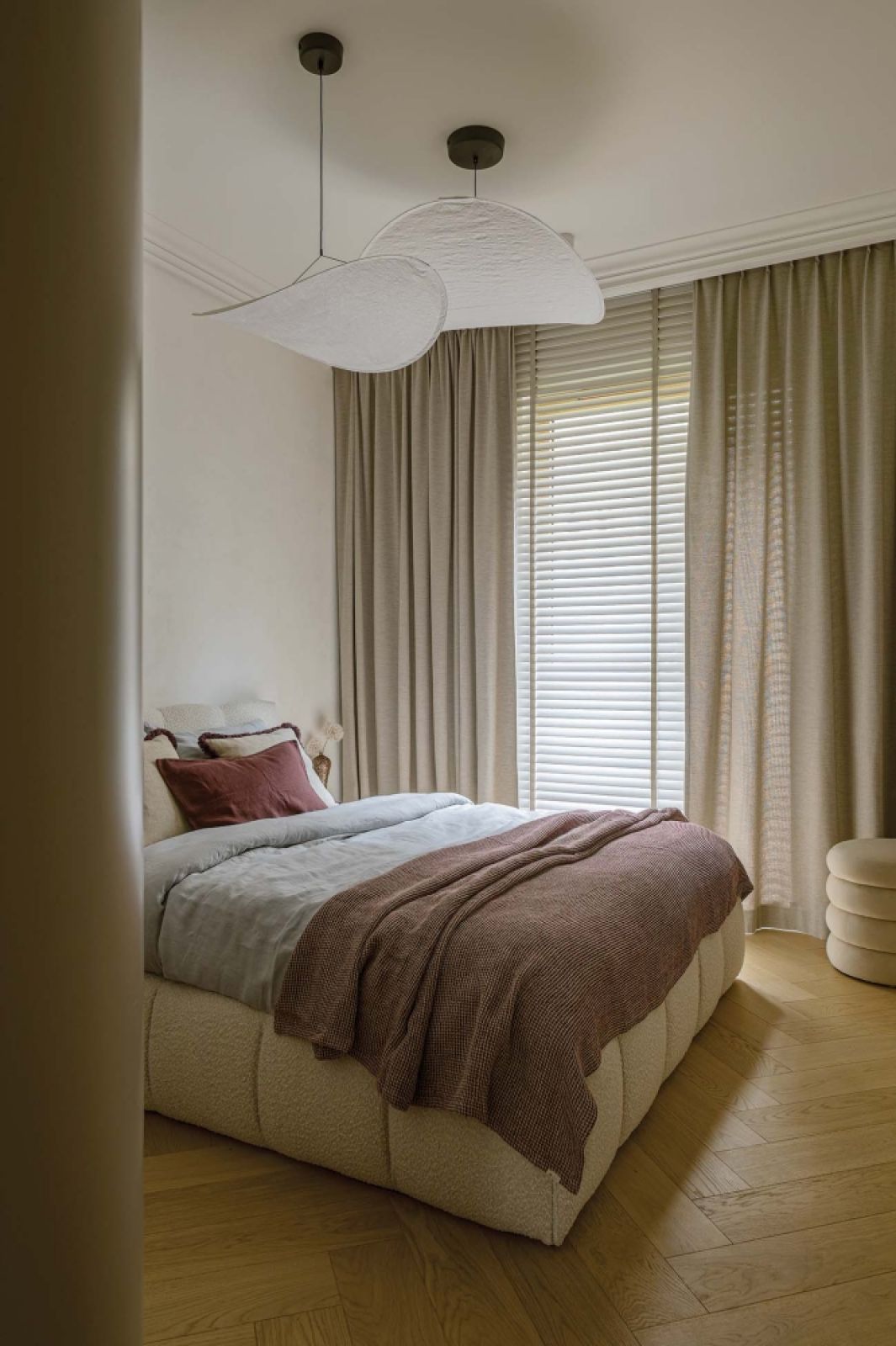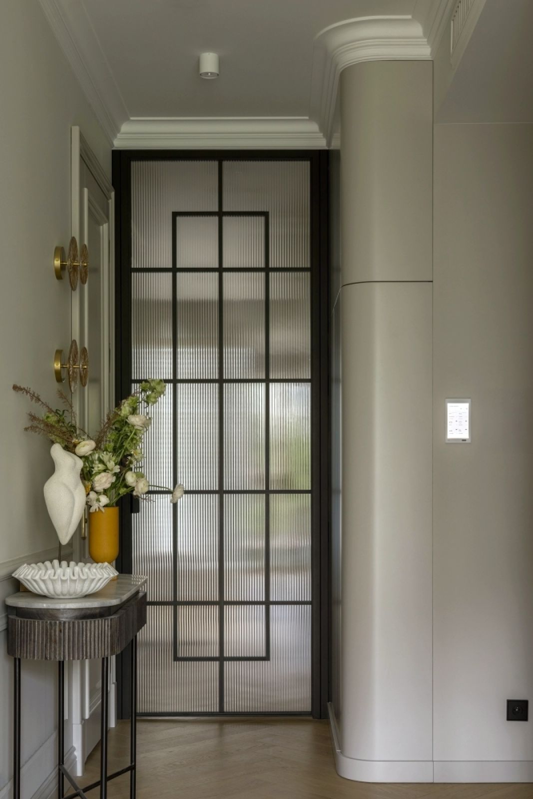 Na części ścian zagościł kolor kaszmirowy – subtelna mieszanka bieli, beżu i szarości. Odcień ten cieszy się ostatnio popularnością, bo idealnie pasuje do wnętrz w stylu modern classic, nowoczesność ociepla, a klasyce dodaje lekkości. Tym, co nowoczesne, a czego nie widać w tym mieszkaniu, jest system inteligentnego domu Gira sterujący wieloma funkcjami (ogrzewanie, klimatyzacja, oświetlenie, żaluzje, itp.).