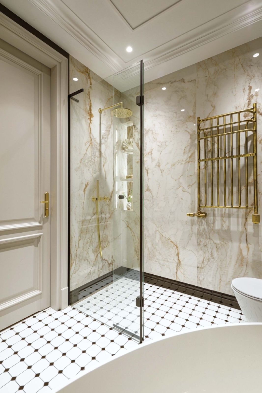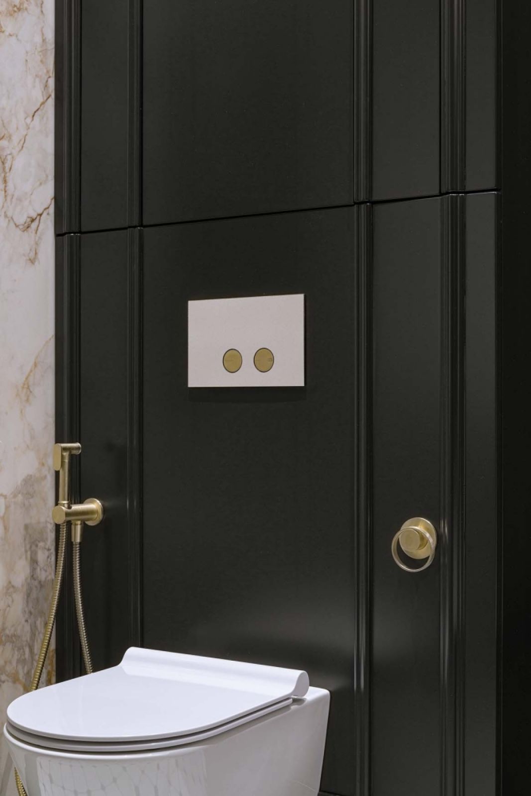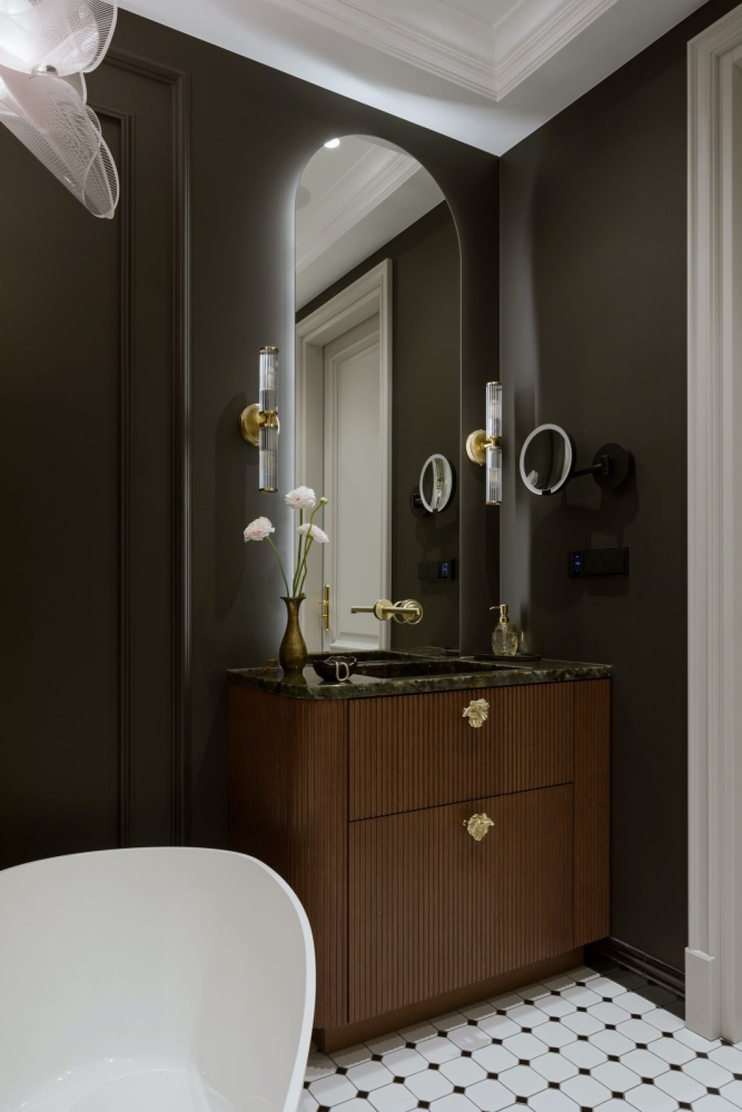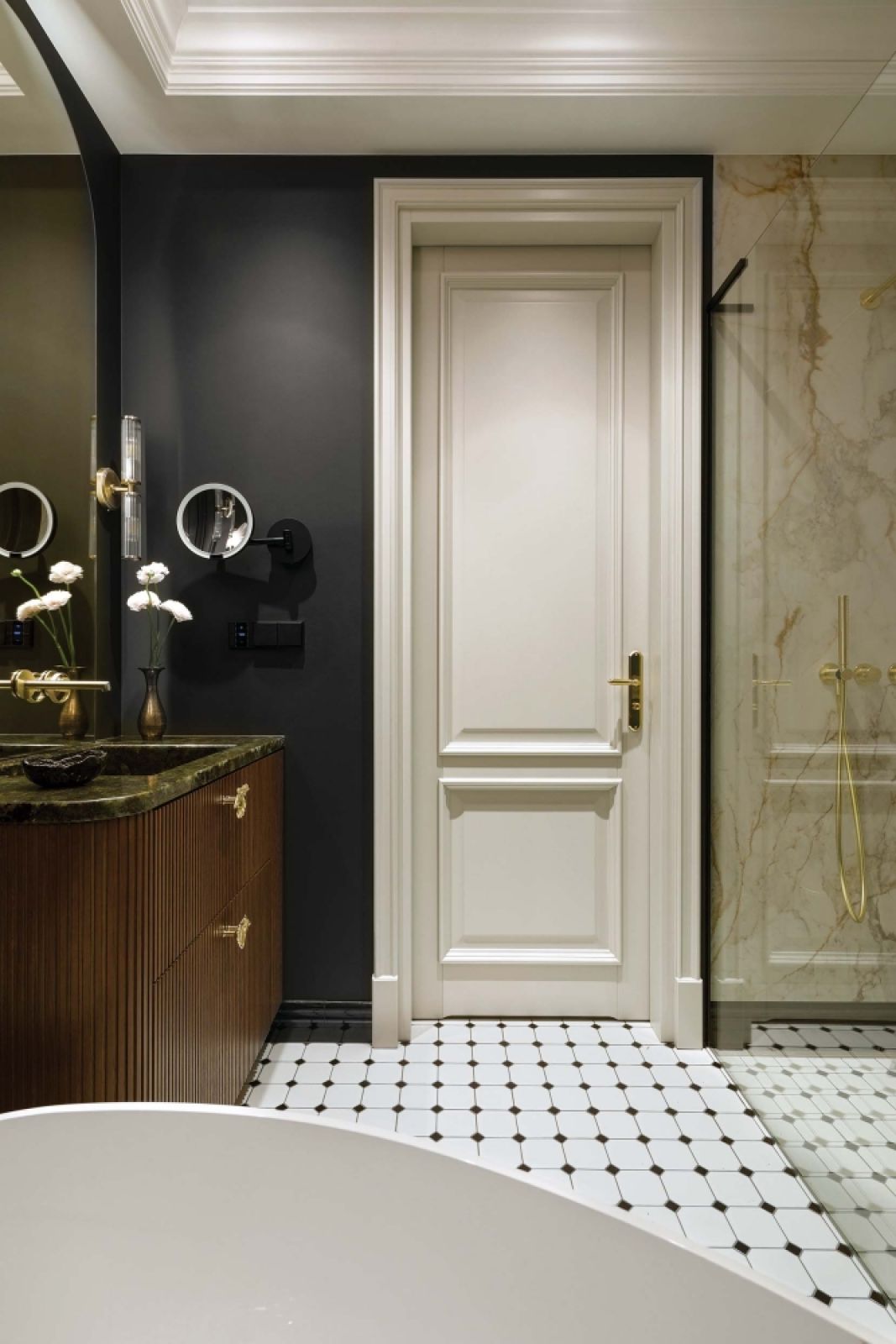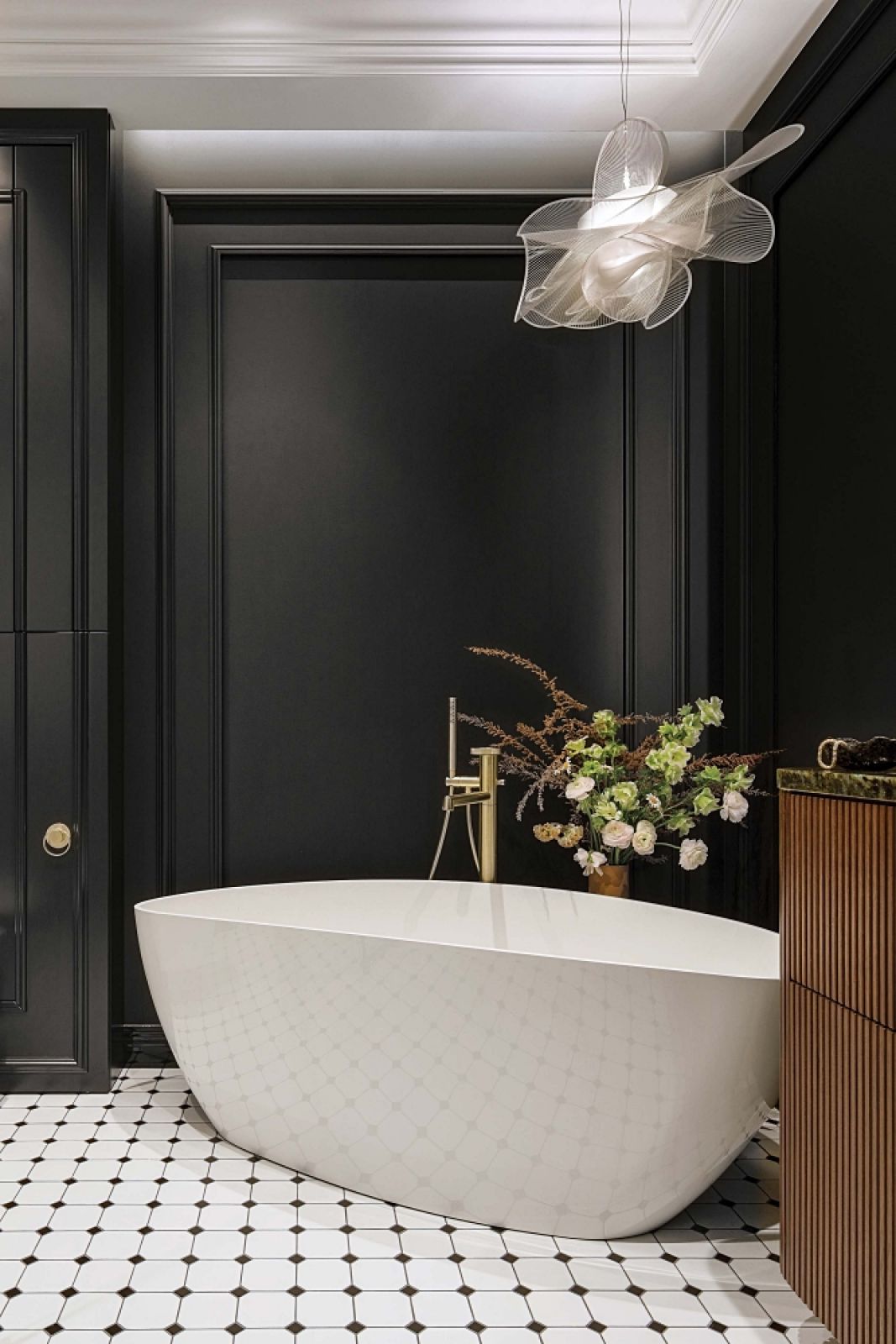Wyjątkowo szykownie wygląda też łazienka. Początkowo cała miała być wyłożona płytami o marmurowym wzorze, ale projektantka wpadła na pomysł, by jedną ze ścian pomalować na czarno. Wyglądało to tak dobrze, że w końcu aksamitna czerń trafiła na trzy ściany. Na ich tle ustawiona skośnie wolnostojąca wanna i akcenty złota wyglądają zjawiskowo.