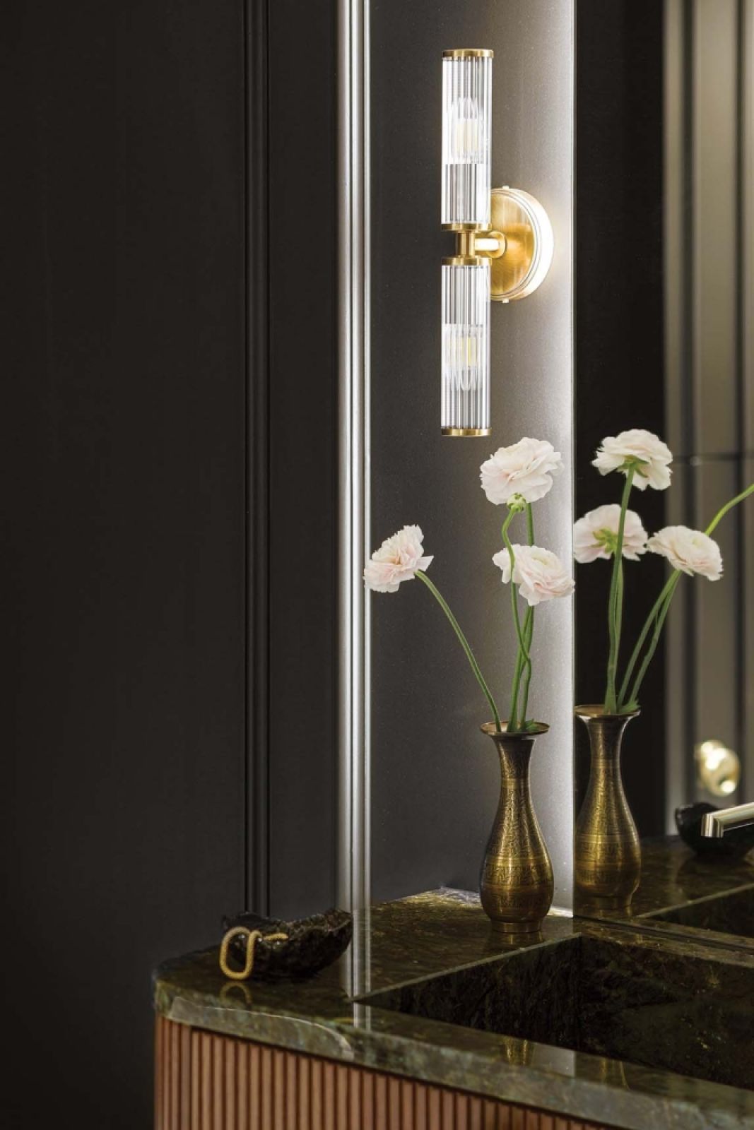 Ukłonem w stronę właścicielki spod znaku Ryb są złote rybki jako gałki w szafce podumywalkowej. W rogu łazienki, noszącej wszelkie znamiona pokoju kąpielowego, powstało miejsce do eksponowania kompozycji kwiatowych. To znak, że gościmy w domu kreatywnej florystki.
