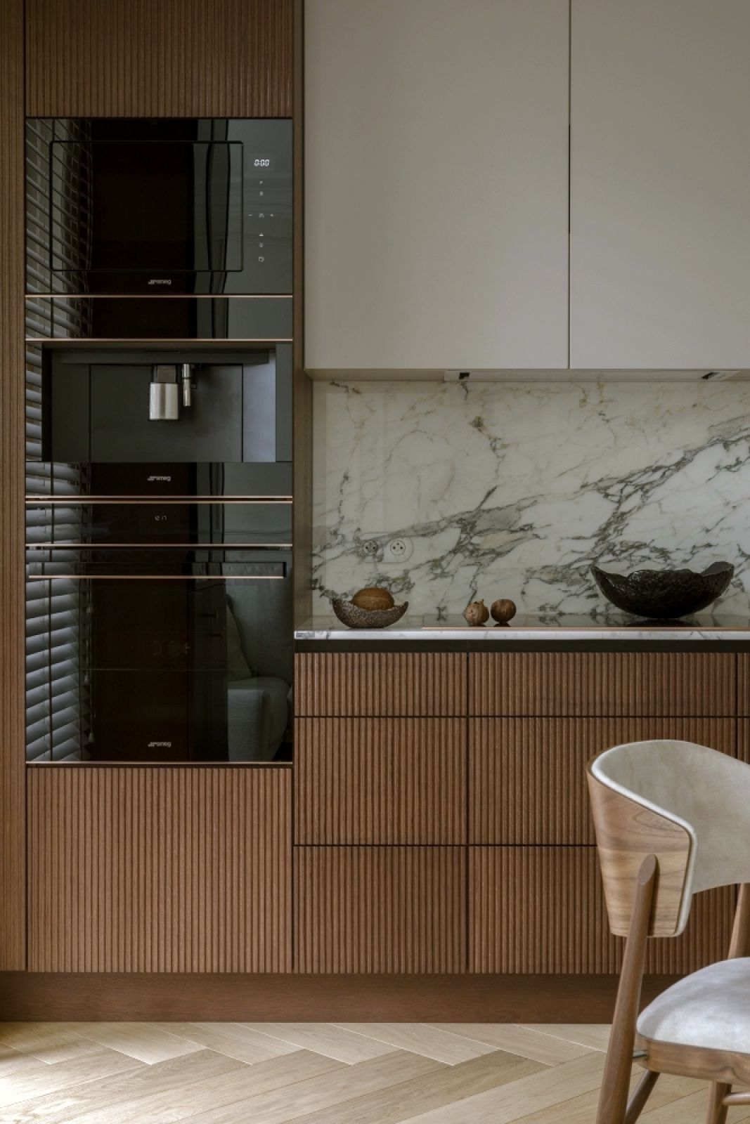 Takie bezkompromisowe podejście do detali znalazło też wyraz w kuchni – Patrycja stworzyła specjalną szufladę na chleb z wyłożonym płótnem koszem i elegancką szklaną przykrywką. Zabudowana za drewnianymi frontami lodówka zyskała z kolei przepiękny i nawiązujący do florystycznych pasji właścicielki uchwyt przypominający łodygę egzotycznego kwiatu.