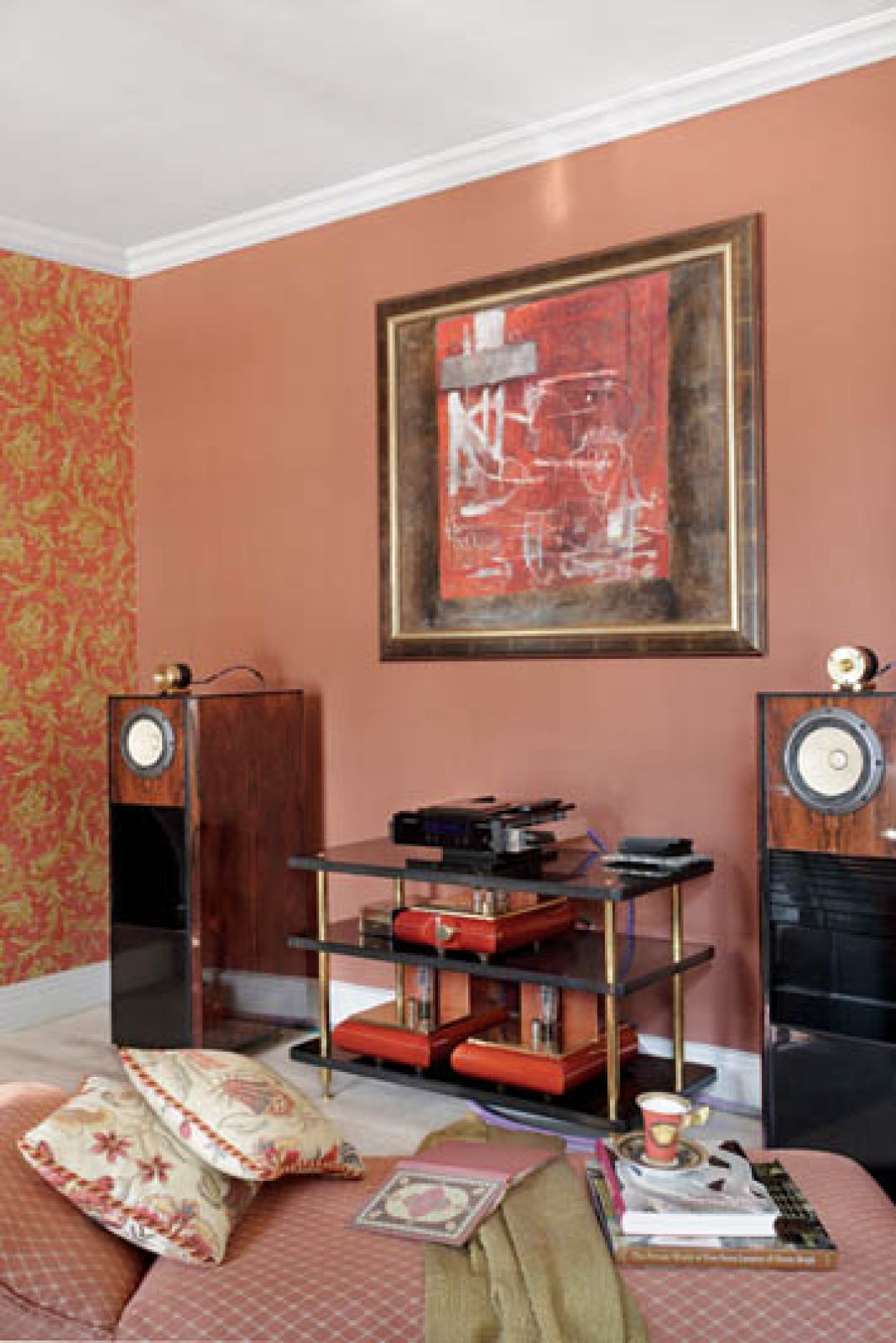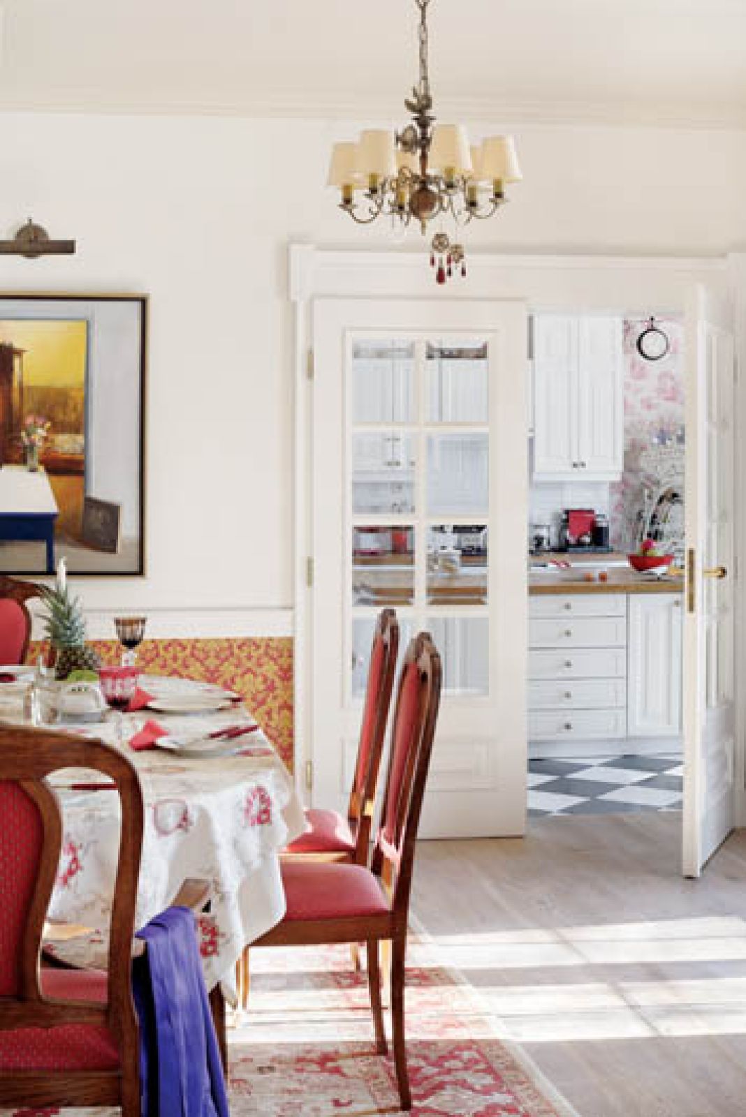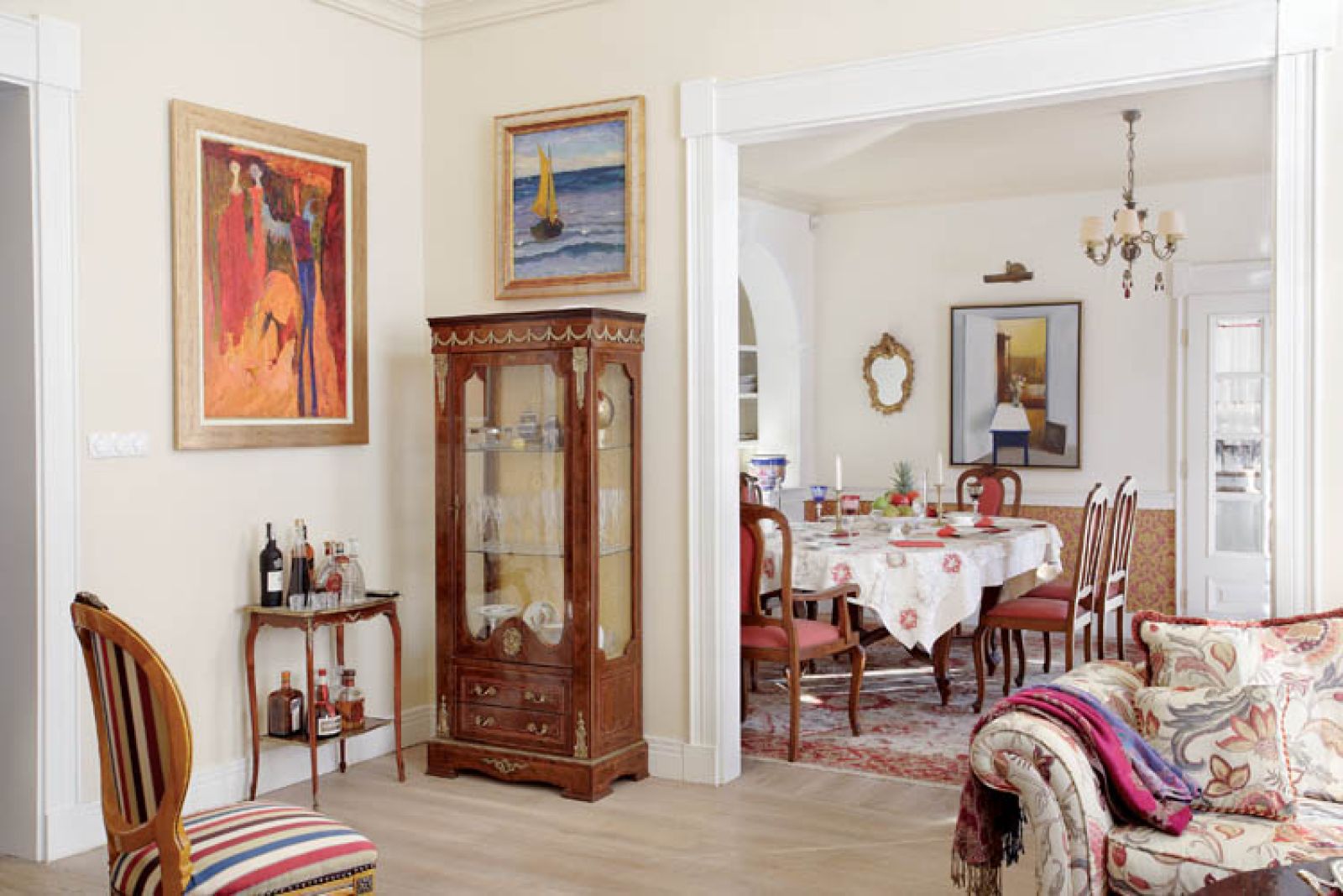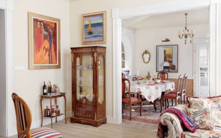 – Jesteśmy kolorowi i lubimy ludzi – mówi o swojej rodzinie właścicielka. Początkowo wszystko miało być w stylistyce art déco. Czysto, przestronnie, bez bibelotów. Oczywiście wyszło dokładnie na odwrót. Jest kolorowo i przytulnie, na ścianach wisi sztuka współczesna. Na podłogach leżą stare dywany, które do domu poprzywoził sprzedawca z Krakowa. Rozkładał je w pokojach i mówił: – To ja zostawię, żeby się państwo z nimi oswoili i jak nie będą pasować, zabiorę. Wszystkie pasowały. W domu pełno jest różnych bibelotów, bo rodzina regularnie wędruje po targach staroci, a raz na jakiś czas wypuszczają się nawet do Paryża.