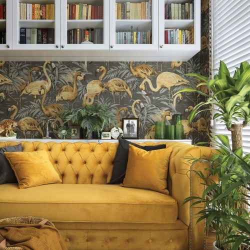 Zaczęło się od tapety w złote flamingi, którą Halina wypatrzyła w jednym z magazynów wnętrzarskich. Dzisiaj każdy się nią zachwyca, bo wygląda jak tkanina położona na ścianie. To przez nią musieli zamówić nową kanapę, obitą miodowomusztardowym pluszem – wcześniej wybrana biszkoptowa nie pasowała.