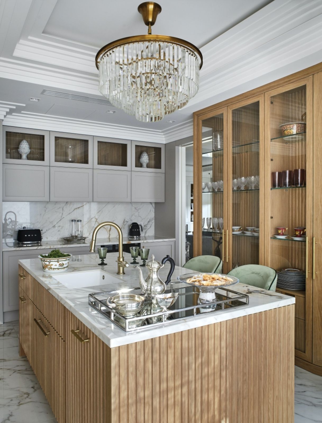 Magda i Maciek w całym wnętrzu starali się przełamywać konkretne, mocne formy elementami lekkimi, ażurowymi, przepuszczającymi lub odbijającymi światło. Na przykład na fronty niektórych elementów zabudowy, które miały być pokryte fornirem, wybrano wersję ryflowaną, która dodaje meblom lekkości. Dla przeciwwagi – do zabudowy kuchennej powstała witryna ze szklanymi półkami, w której Adriana eksponuje kolekcję swojej ukochanej porcelany Rosenthal według projektu Versace – „Ogród motyli” oraz jeden z prezentów ślubnych, czyli świeczniki z kryształkami Swarovskiego.