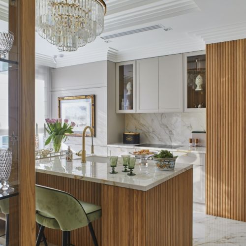 Zabudowę stolarską w mieszkaniu wykonał Piotr Cieślak z firmy Venari, venari.pl. Ryflowany fornir jest na wyspie kuchennej i na ścianie w salonie.