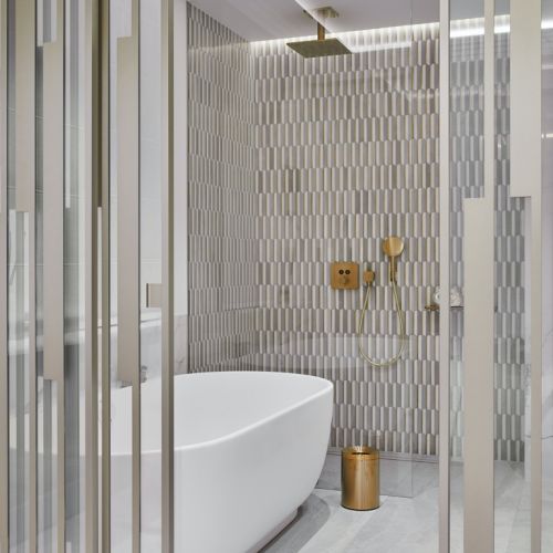 Podobne, łagodzące ostrą formę triki pojawiły się w łazience – na ściankę z przesuwnymi drzwiami zrobioną z inteligentnego szkła (które w razie potrzeby zamienia się w szkło mleczne) naklejono metalowe płaskowniki w kolorze szampańskiego złota nawiązujące do koloru wezgłowia łóżka i mozaiki pod prysznicem w łazience.