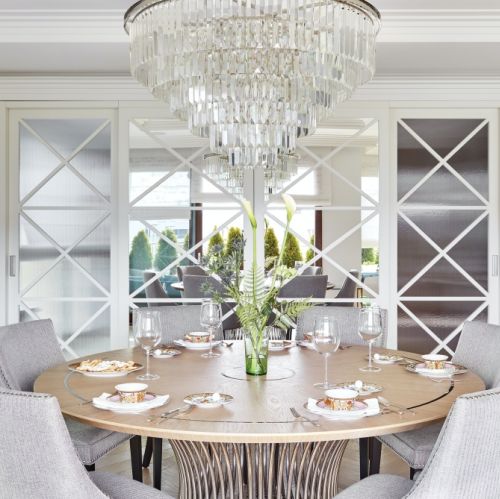 Lustra na przepierzeniu między kuchnią i jadalnią powiększają przestrzeń, odbijając światło padające od strony loggii, a przesuwne drzwi zostały zrobione ze szkła ornamentowego i ozdobione (specjalnie dla Adriany) delikatnymi szprosami. Do ciężkiej narożnej sofy Linteloo Hamptons dostawiono stolik kawowy ze szklanym blatem. Zrobiony na zamówienie stół w jadalni ma ciężki blat z forniru z metalową intarsją, ale podtrzymywany jest przez ażurową nogę. W podwieszanych sufitach, zasłaniających instalację klimatyzacyjną, ukryto lampy ledowe dające rozproszone światło, które bardzo lubi Krzysztof, a dla Adriany dodano duże kryształowe żyrandole Odeon z Esencja Design.