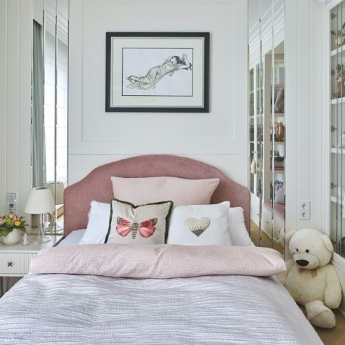 Ale pierwsza propozycja projektu okazała się zbyt… męska. Z bardzo prostej przyczyny – to już nie miało być mieszkanie dla kawalera, tylko dla rodziny. Swoją żonę Adrianę Krzysztof poznał 11 lat temu, a dokładnie rok później urodziła się córka Emma. Wiadomo – panie lubią trochę inny styl, potrzebują subtelnych kolorów, miękkich tkanin, dużo luster i delikatnych dekoracji. No cóż, podobno mężczyźni są z Marsa, a kobiety z Wenus, natomiast pieski… pewnie wprost z Syriusza. York Oskar i Maltanka Bella też miały tu zamieszkać.