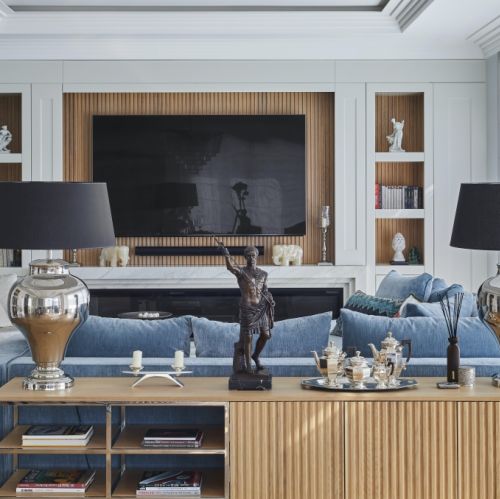 To właśnie obrazy współczesnych artystów, m.in. Mirona Białego i Andrzeja Umiastowskiego, a także kilka starych sztychów i rzeźb zadecydowało o charakterze tego wnętrza. Jadeitowe słonie wizualnie podtrzymują na swych grzbietach telewizor, cesarz Marek Antoniusz z brązu świetnie czuje się na komodzie z ryflowanym fornirem, a porcelana od Versace w towarzystwie złotych dodatków. – Z takich wnętrz, w których udaje się pogodzić różne upodobania gospodarzy i dopasować nowe rzeczy do dawnych, jesteśmy najbardziej dumni – mówią projektanci.