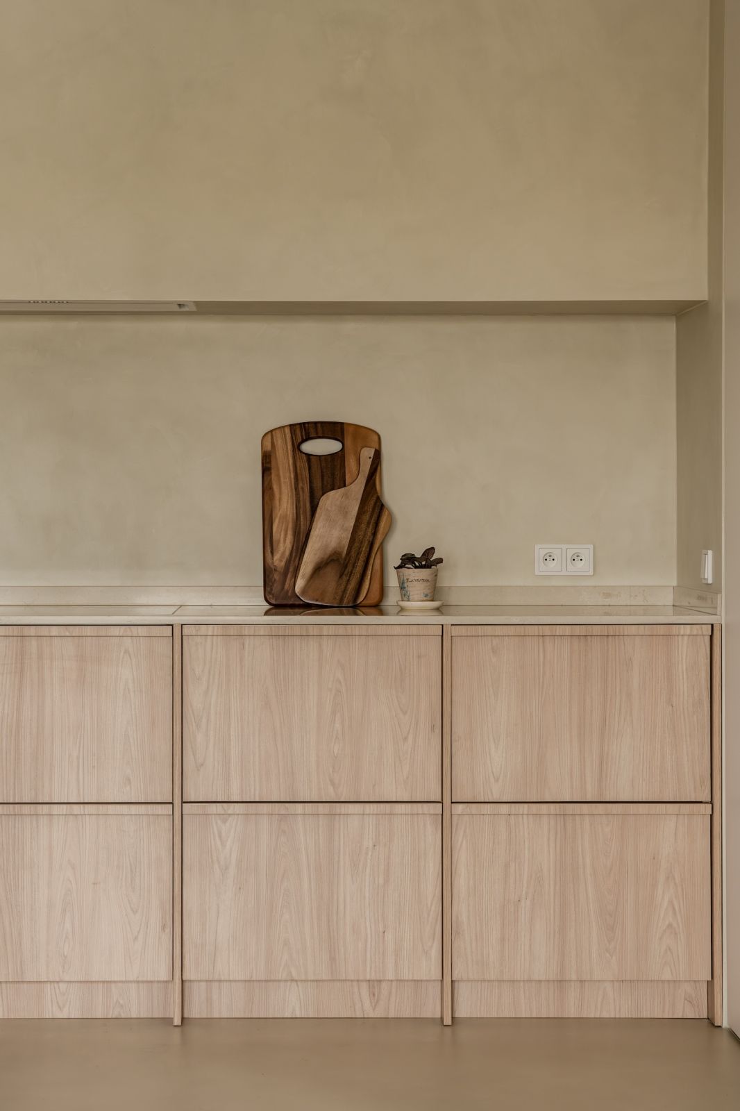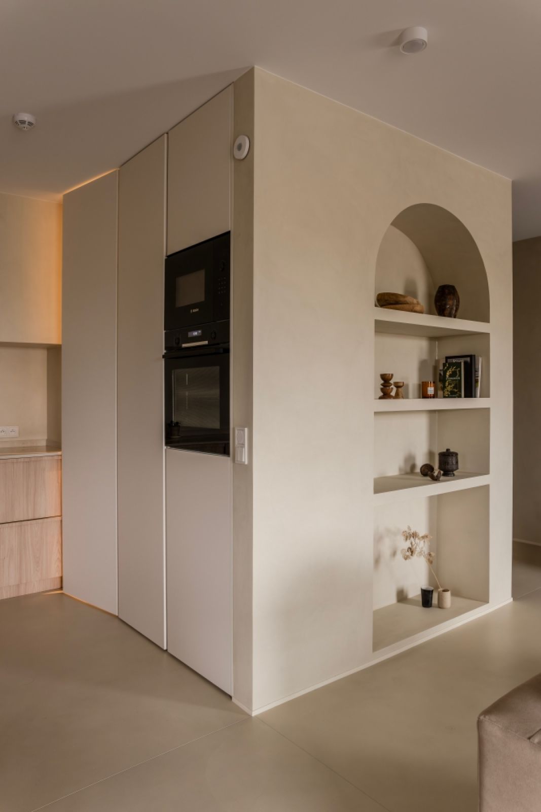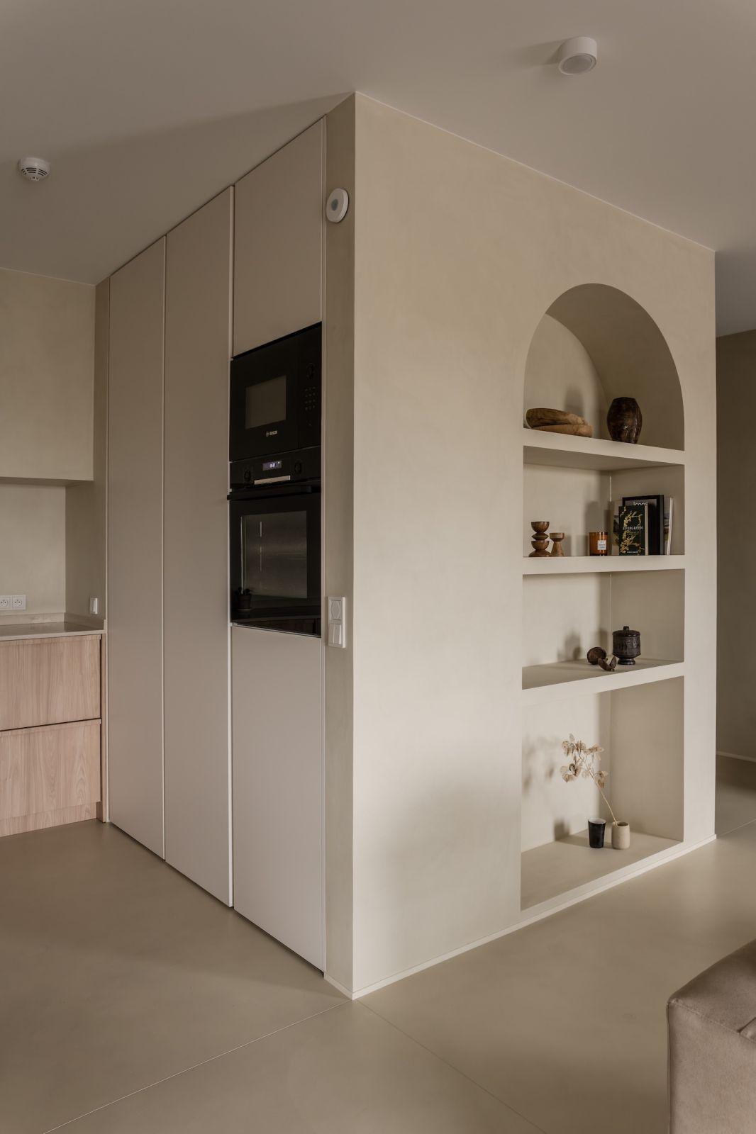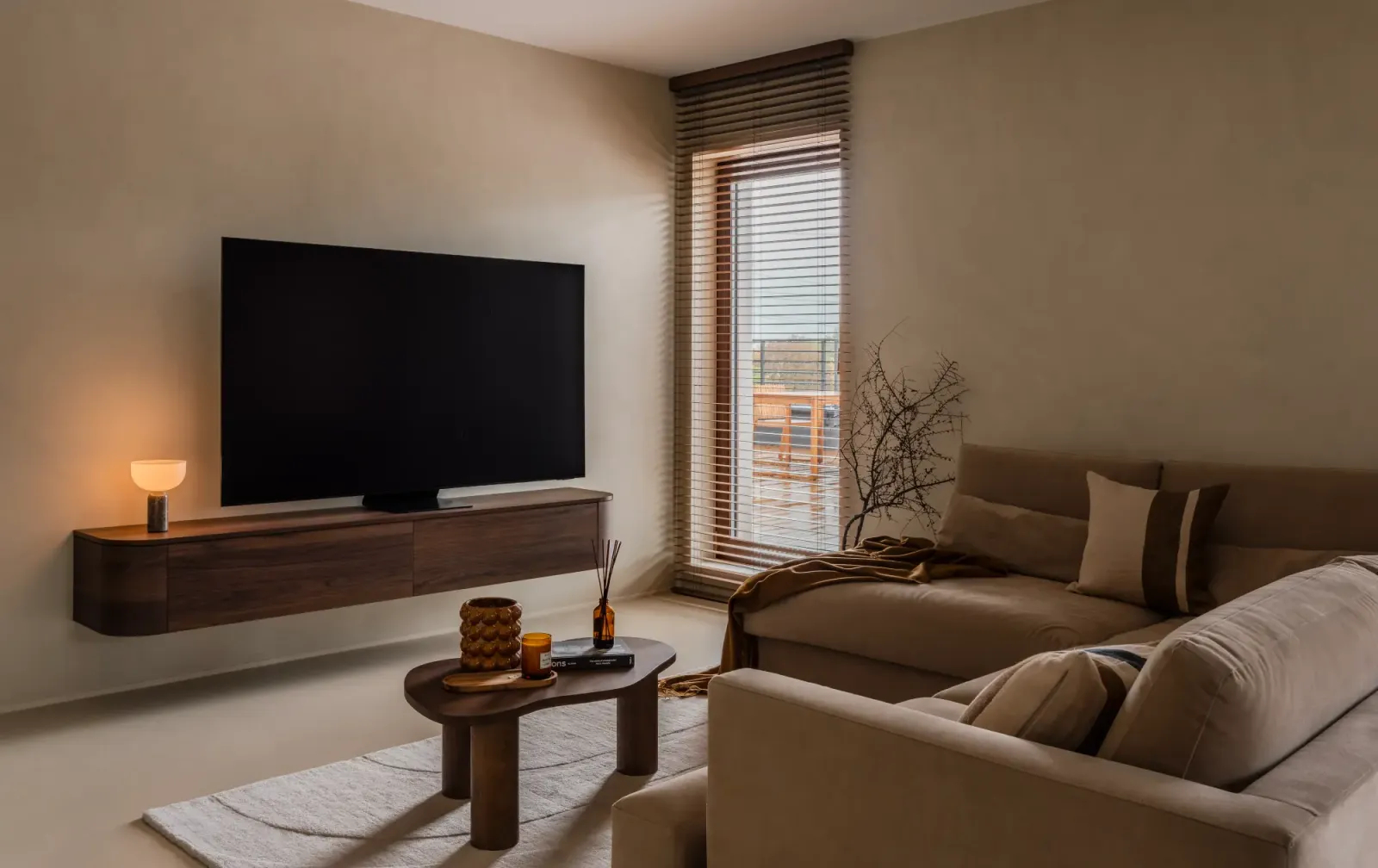 Salon w stylu japandi – mikrocement i naturalne drewno