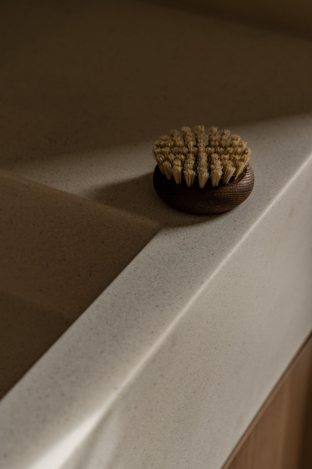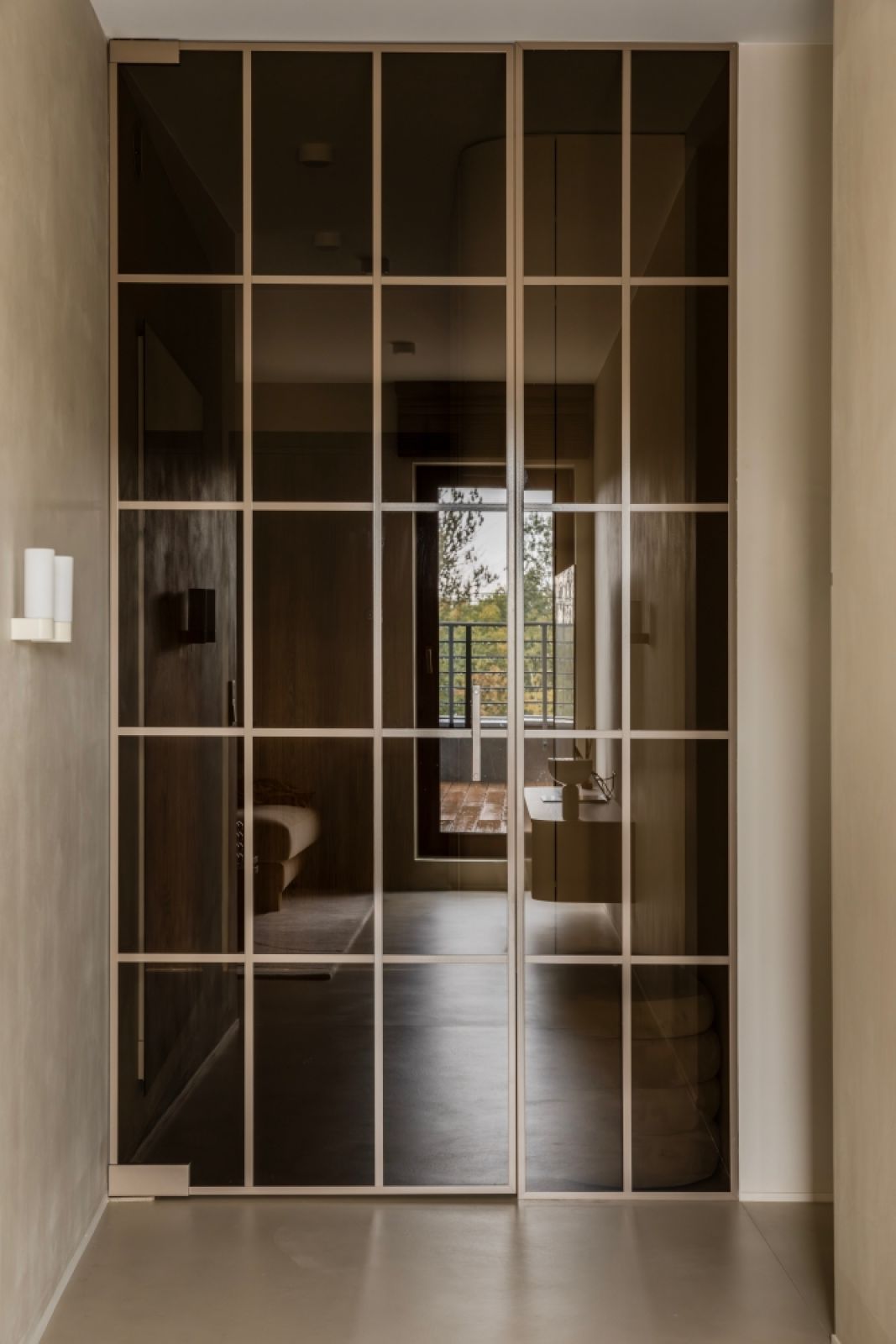 W całym mieszkaniu dominują kolory ziemi. Delikatne beże gdzieniegdzie przecieranego mikrocementu przypominają piasek na plaży po deszczu.