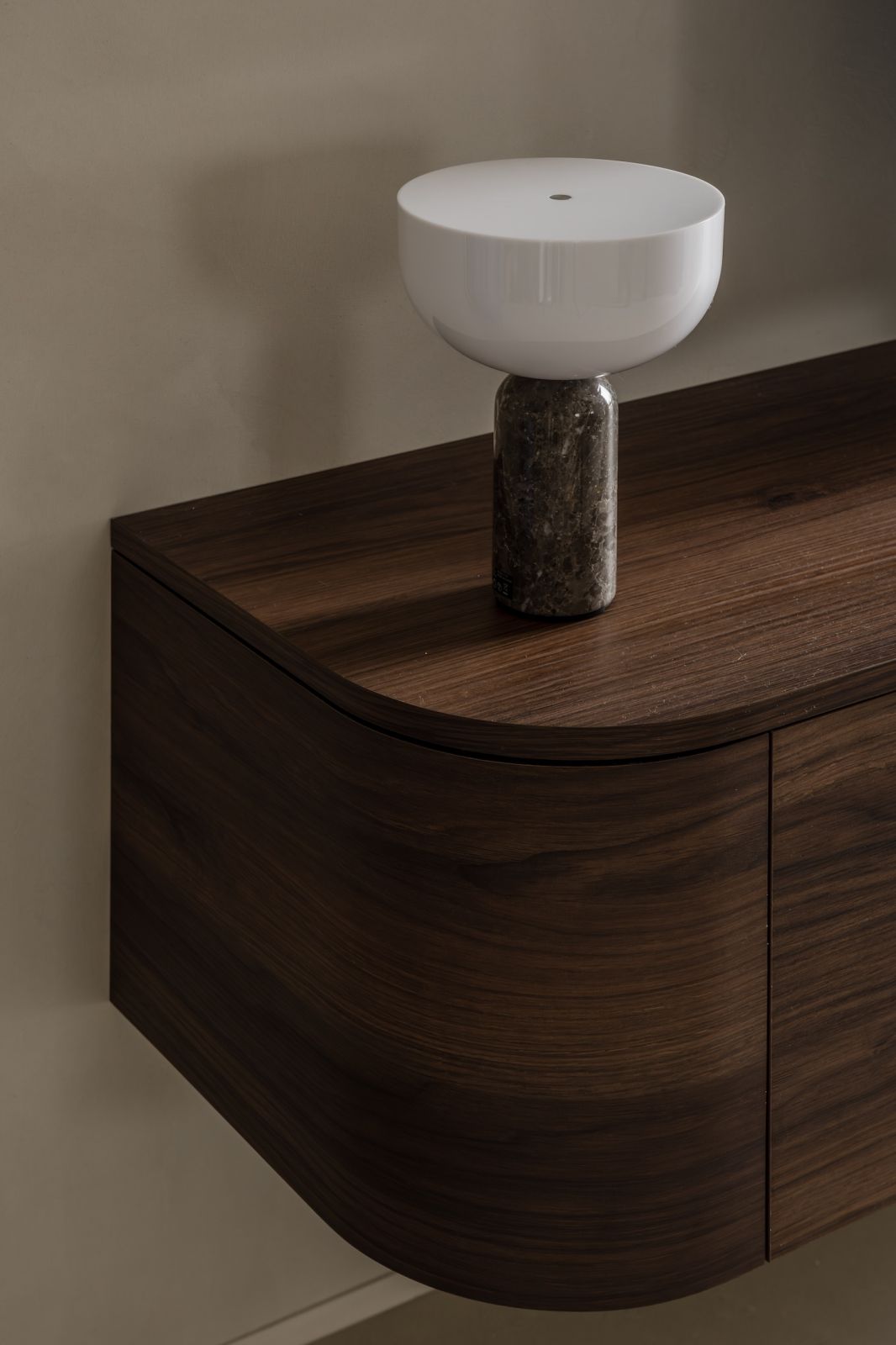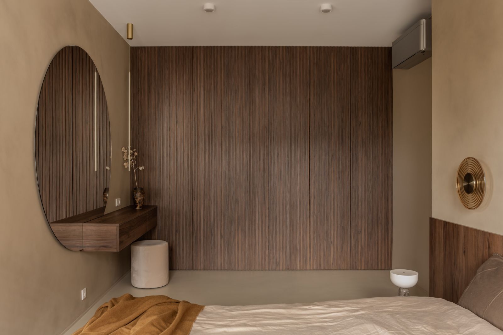 Znalazło się też miejsce na ciekawą toaletkę właścicieli – minimalistyczną w formie. Duże okrągłe lustro zostało połączone z prostą podwieszaną na ścianie konsolą, w której zaprojektowano pojemną szufladę na kosmetyki i drobne akcesoria. Całość tworzy wysmakowaną geometryczną kompozycję, przy której stanął kompaktowy puf w miękkiej jasnej tapicerce.