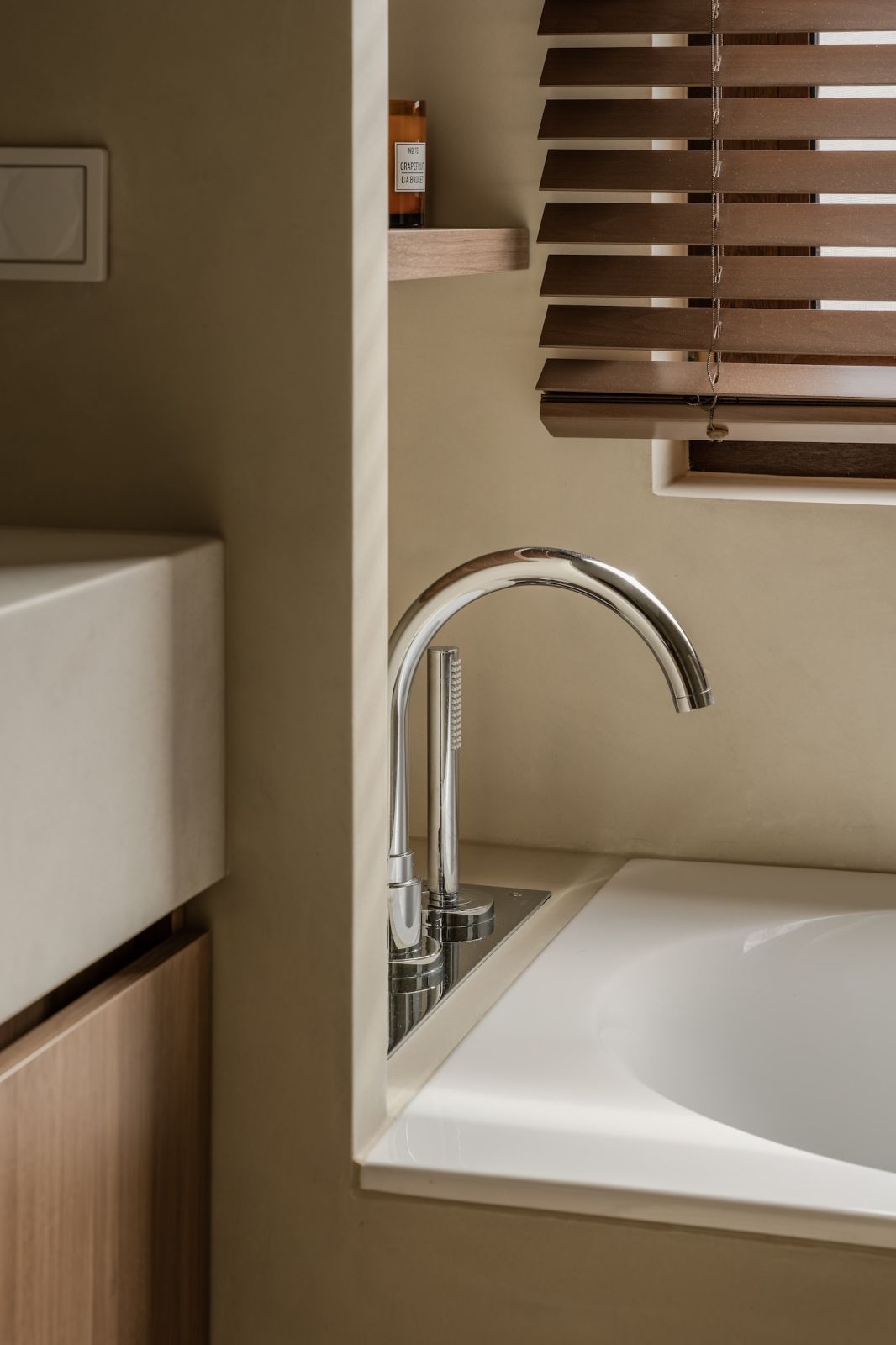 Pod oknem stanęła duża wanna, która częściowo została oddzielona od reszty łazienki lekką ścianką wykończoną w mikrocemencie – sprawia wrażenie, jakby znajdowała się we wnęce. To coraz częściej spotykane rozwiązanie, które nadaje strefie kąpielowej bardziej intymny i przytulny charakter. Okno, podobnie jak w całym mieszkaniu, przesłaniają drewniane żaluzje.