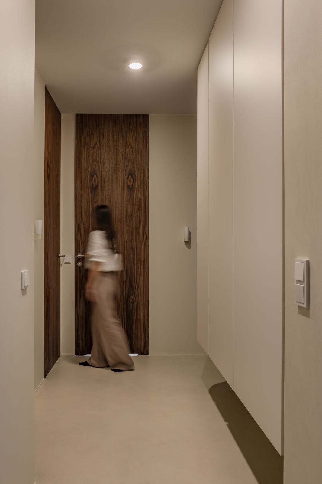Strefa dzienna, na wprost wejścia, została zaprojektowana jako otwarty plan dostępny dla wszystkich, który łączy ze sobą kuchnię, jadalnię oraz salon. Przestrzenie przenikają się w łagodny sposób przez wykończenia użyte w projekcie. Jasne i ciemniejsze odcienie mikrocementu scalają podzielone wnętrze sprawiając, że pomimo wyraźnych stref, odczytuje się je jako spójną całość – opowiada architektka Agnieszka Prym, właścicielka pracowni am.home.