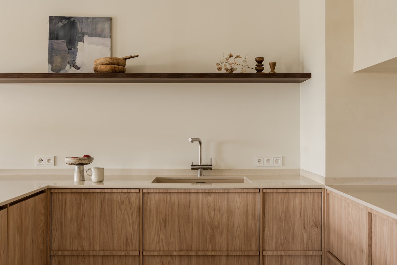 W kuchni kremowe odcienie ścian nad szafkami ochładza śnieżnobiały sufit, a ciepła dodają forniry na szafkach z widocznym rysunkiem słojów drewna.