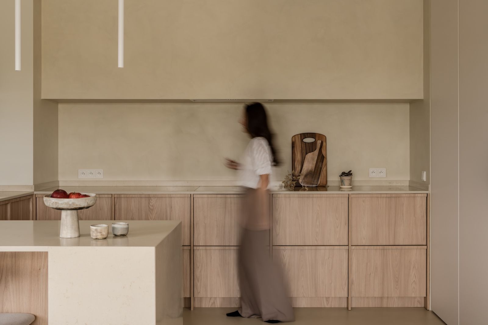 Niewidoczny jest także okap kuchenny, który chowa się w wielkim, szerokim na całą długość kuchni fartuchu pięknie zarzuconym przecieranym mikrocementem.