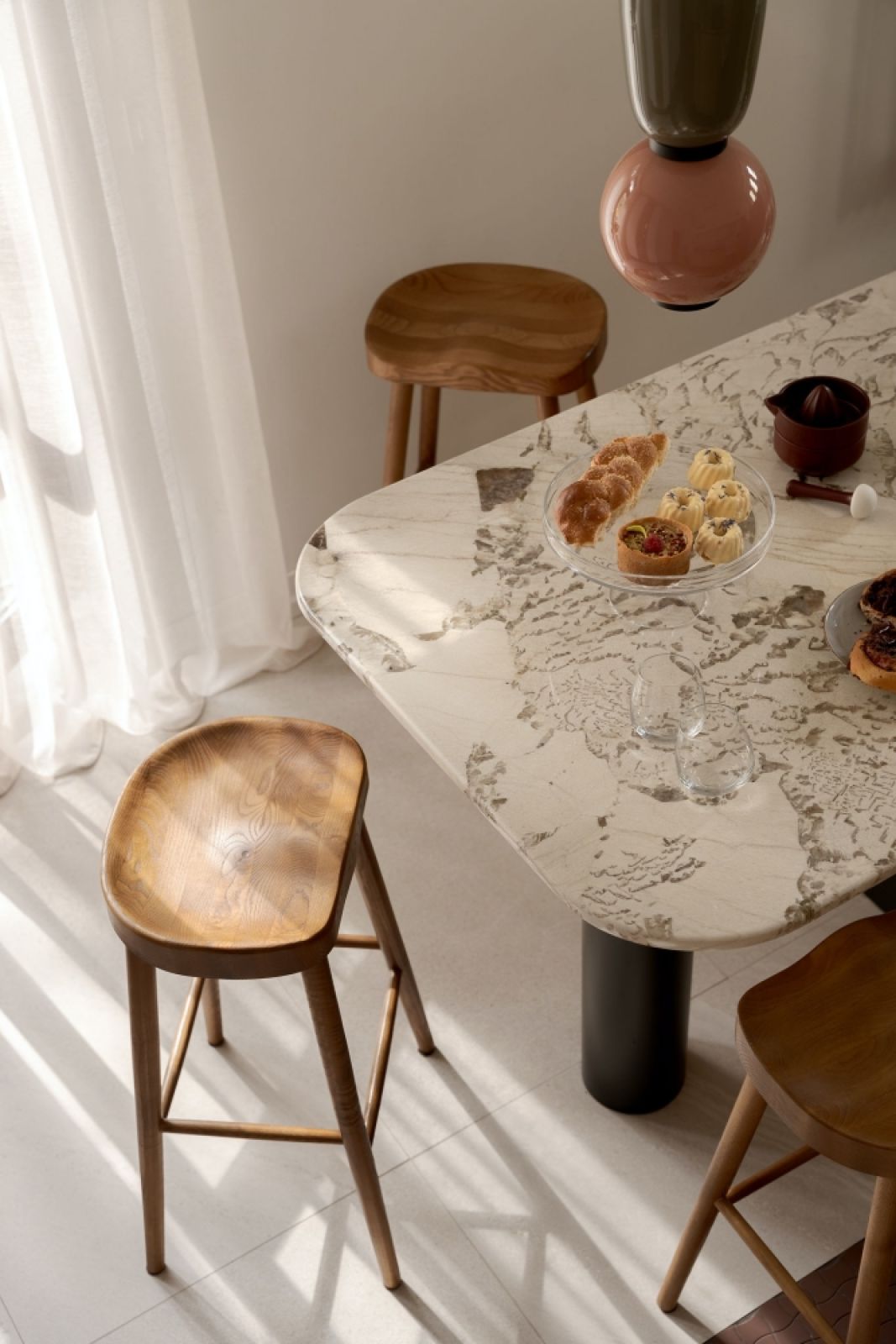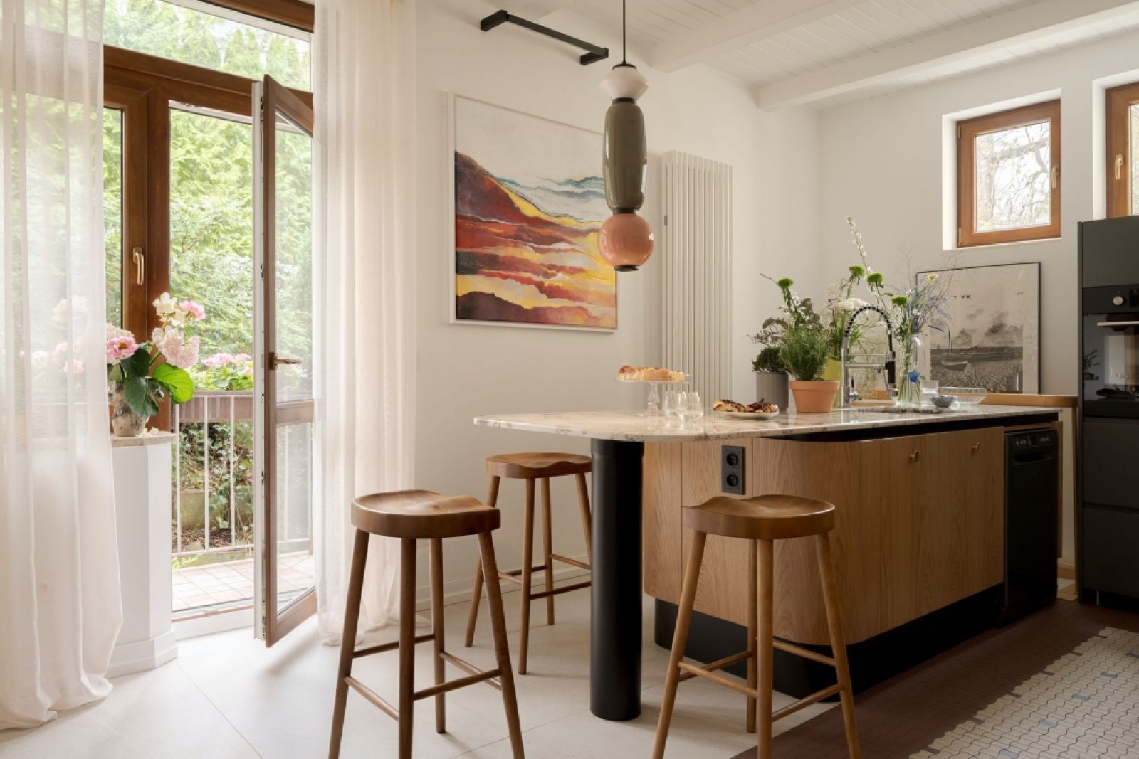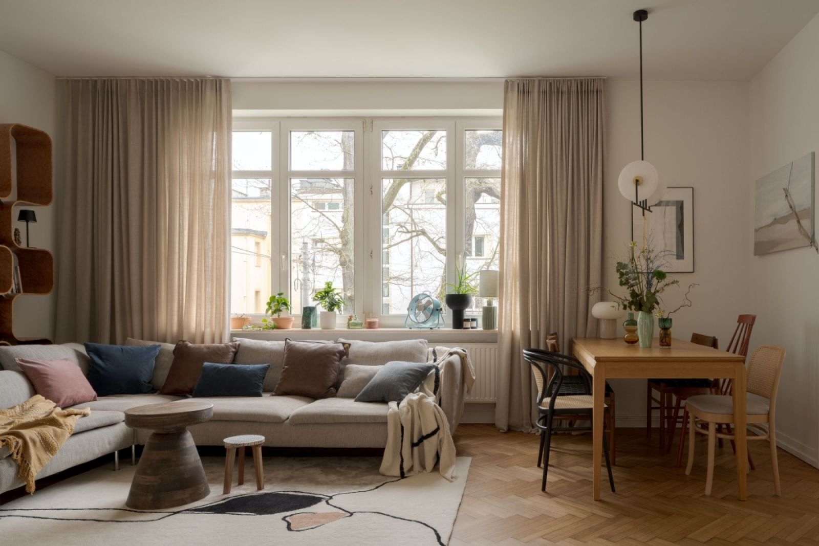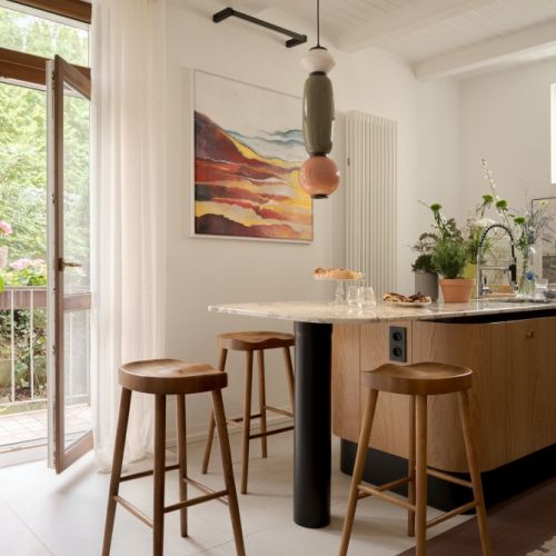 To mieszkanie w modernistycznej gdyńskiej kamienicy jest spójnie, radosne, zapraszające. Pięknie wpisuje się w otoczenie domu, które tworzą̨ drzewa. Zaglądając przez okna do środka stają się̨ częścią̨ wysmakowanego stylistycznie wnętrza.