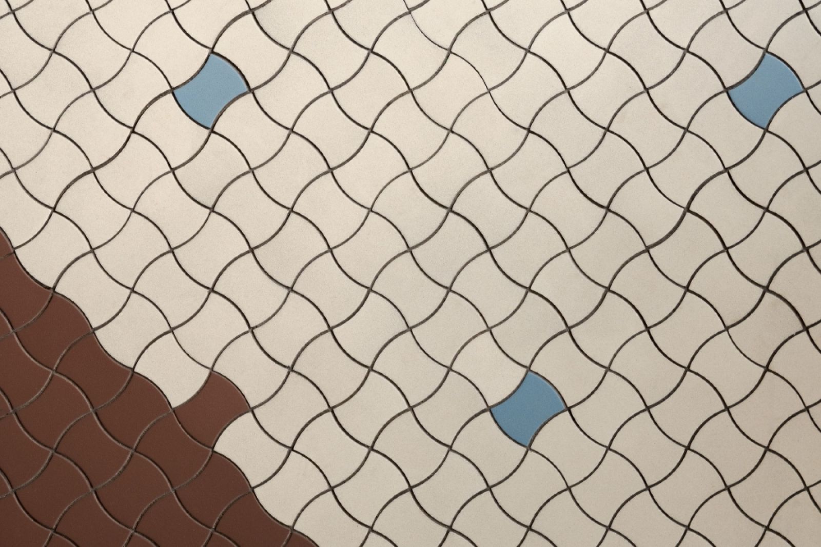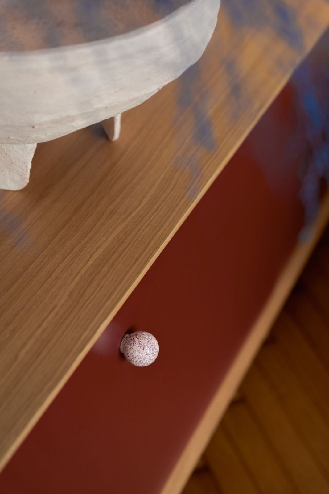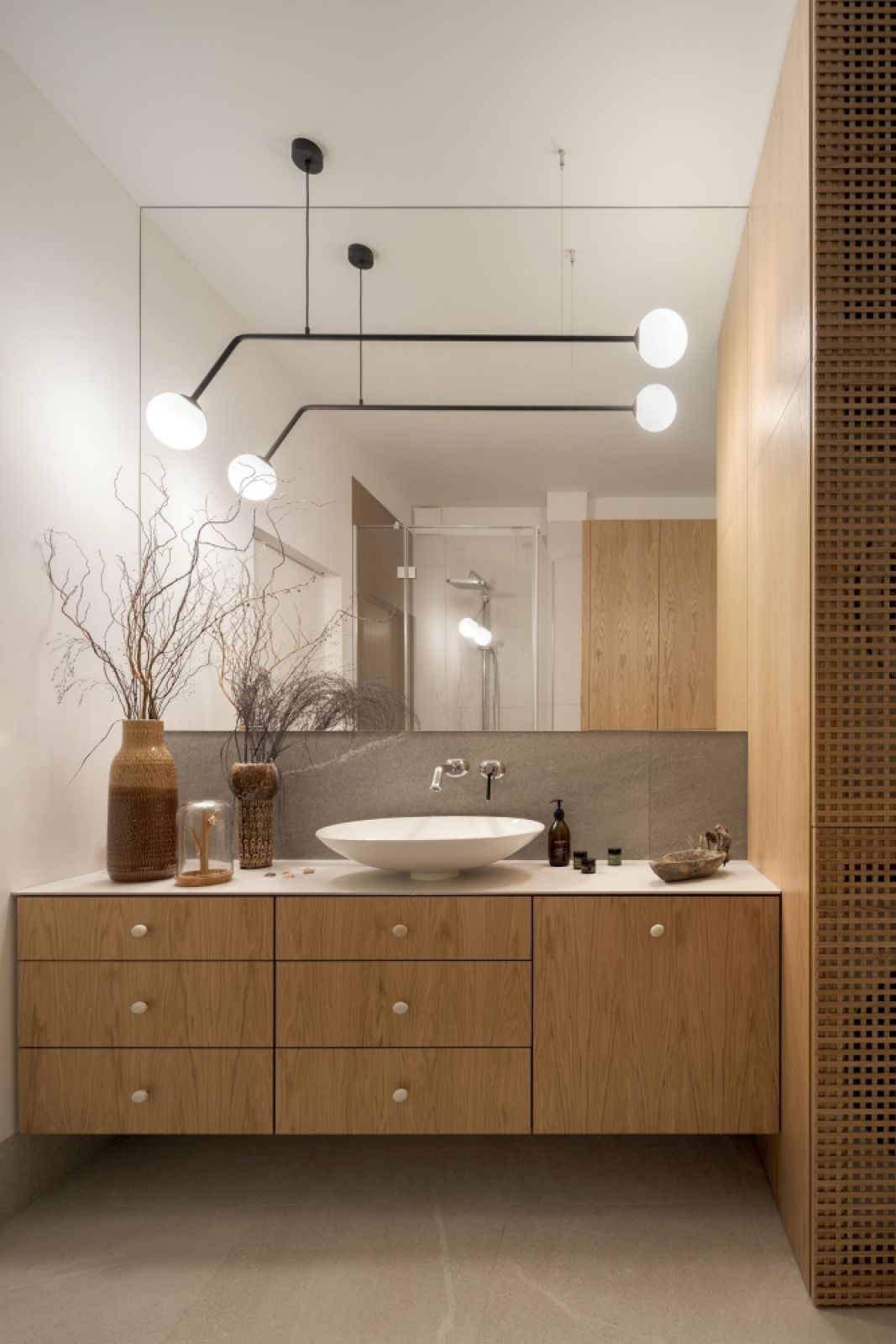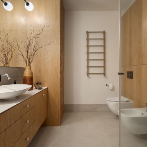 Charakterystyczna w tej przestrzeni jest bardzo duża, pojemna szafa z zaokrąglonym narożnikiem oraz wnęką na buty w dolnej części. Górny cokół szafy, pokryty tym samym kolorem co sufit, tworzy jego kontynuację. Niebieskie, mocne kolorystycznie lampy tworzą̨ ciekamy element uzupełnienia dla ciepłych barw na podłodze, suficie i wykończeniach meblowych. Wszystkie drzwi są̨ ukryte za fornirowanymi okładzinami.