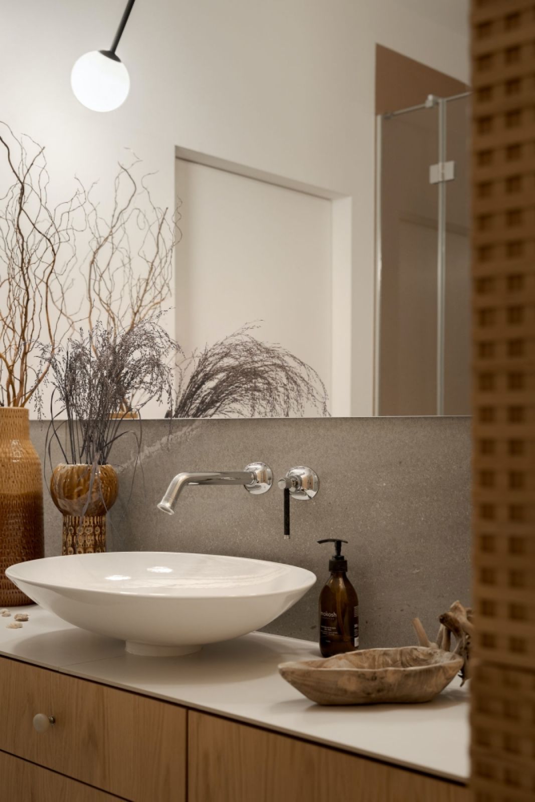 – Kuchnia to prawdziwa perełka, wiele elementów wnętrza zostało odrestaurowanych – mówi Sylwia. – Drewniany sufit, zabudowa okapu czy piec typu koza. Układ kuchni został całkowicie zmieniony i dopasowany do potrzeb życia dużej rodziny. Zaokrąglone narożniki wpisują̨ się w modernistyczny charakter miejsca, natomiast użyty na blacie kamień pokazuje piękno natury – opowiada projektantka. – Korzystając z blatu codziennie można zachwycać się̨ różnorodnością wzorów na tym szlachetnym materiale. Wszystko, co znajduje się w tym wnętrzu, zostało starannie dobrane pod względem kolorów i faktur.